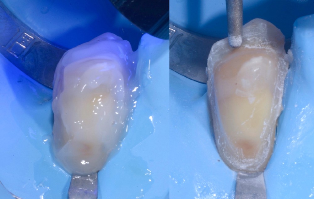 - L’eau et le solvant résiduel peuvent compromettre la performance des adhésifs universels après leur application. Un séchage prolongé à la soufflette pendant 15 à 30 secondes, contre les 5 à 10 secondes recommandées par le fabricant, permettrait d’améliorer les propriétés adhésives immédiates de ces adhésifs [63, 64].