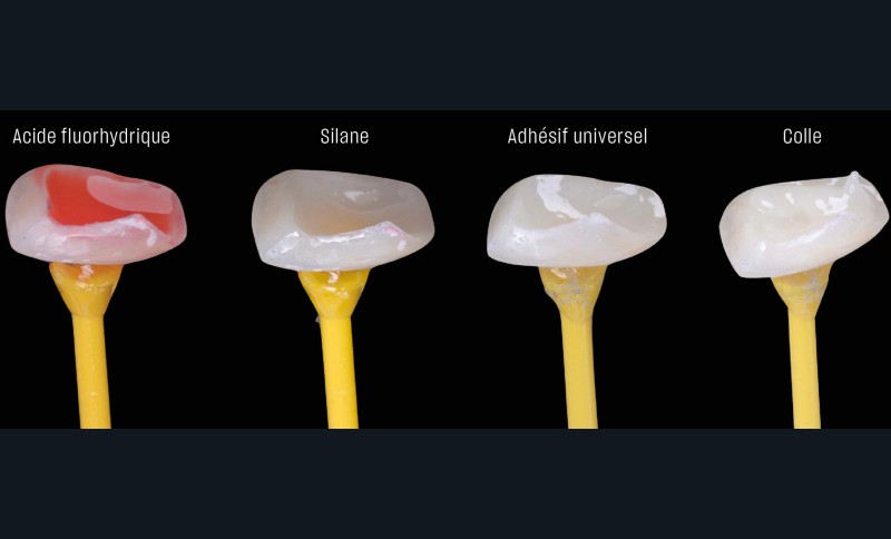Pour le collage des restaurations en zircone, plusieurs méthodes de prétraitement mécanique et chimique ont été proposées [77-79]. Les méthodes mécaniques qui augmentent la rugosité de la surface de la zircone peuvent optimiser les forces de collage en améliorant l’imbrication micromécanique [79, 80]. Les prétrai–tements chimiques avec des solutions de silane ou des primers zircone contenant des monomères fonctionnels tels que le 10-MDP, l’acrylate d’acide phosphonique ou des primers contenant des anhydrides sont connus pour favoriser la liaison chimique avec la zircone [79, 81]. Ainsi, les stratégies recommandées pour une liaison résine-zircone durable sont :