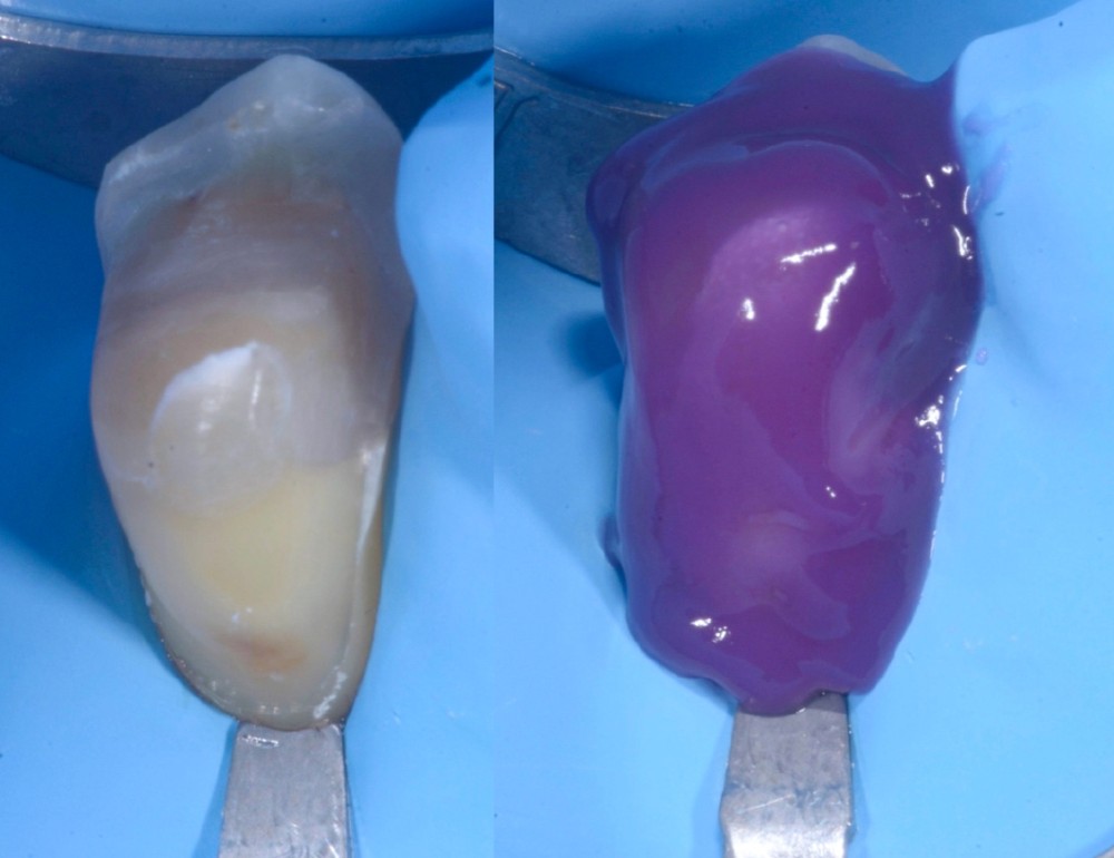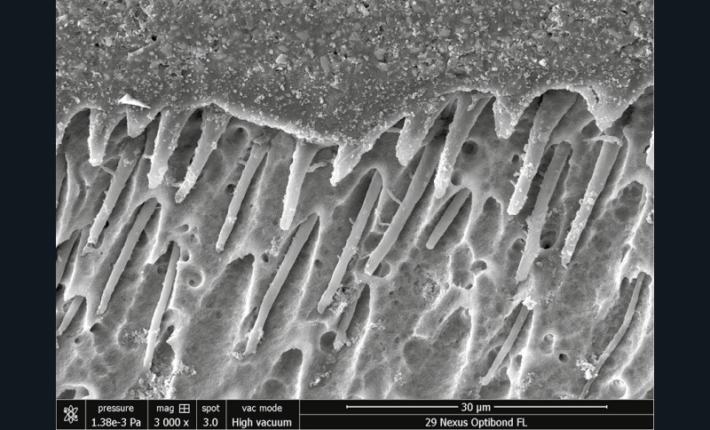 – La première est le mordançage à l’acide de la surface dentinaire. L’acide phosphorique est utilisé pour créer une couche poreuse et augmenter l’énergie de surface et la mouillabilité [6, 7]. Il optimise ainsi le collage et c’est l’acide le plus couramment utilisé dans les restaurations dentaires [8].