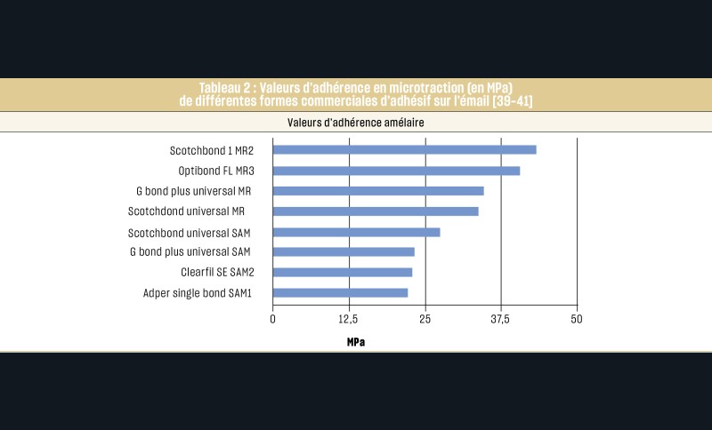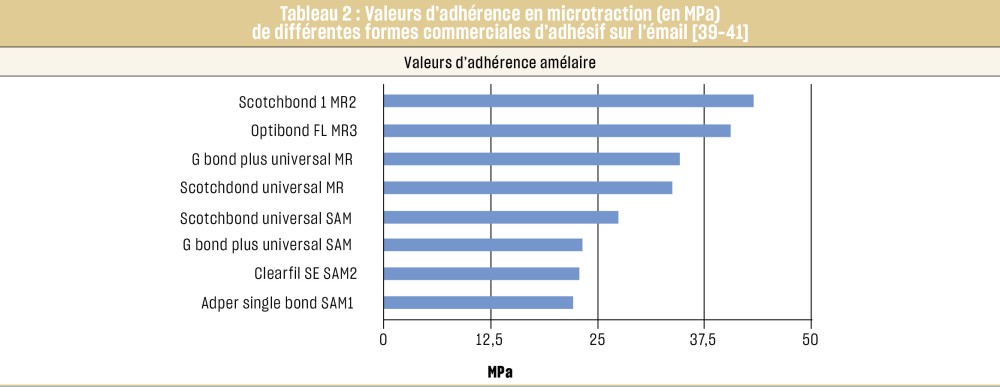 - les adhésifs universels « intermédiairement forts » : pH < 1,5 [27]. (Tableau 1).