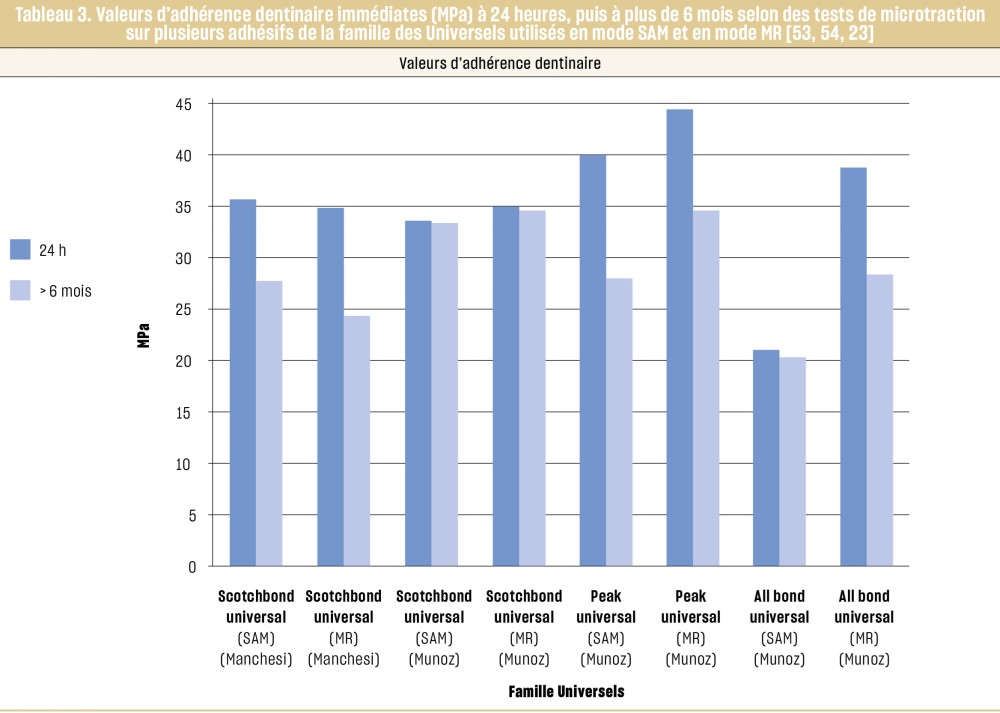 Finalement, certaines études comparatives montrent que les adhésifs les plus performants et les plus stables sur une surface principalement représentée par de la dentine saine sont les MR3, les SAM2 et les adhésifs universel doux utilisés en mode MR ou SAM [68-71] (fig. 8-10).