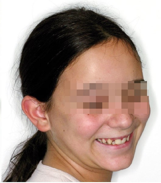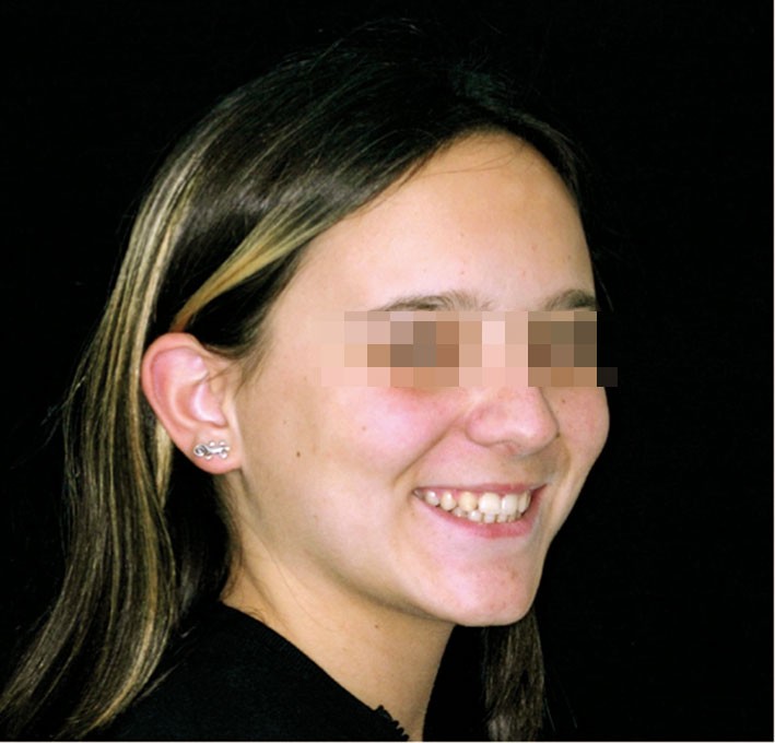Les photographies de fin de traitement (fig. 4 et 5) montrent la préservation de l’équilibre facial et le respect du profil sous-nasal qui, malgré la croissance, ne s’est pas creusé. Le sourire est très harmonieux et révèle, comme les photographies endo-buccales, la très bonne intégration des canines substituées, après légère coronoplastie de leur pointe.