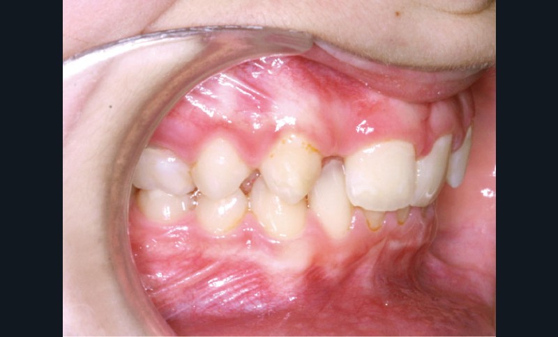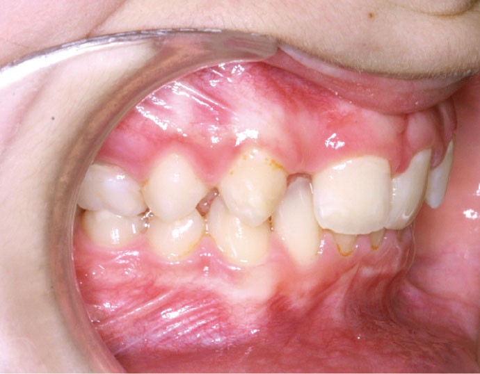 Les vues endo-buccales (fig. 2) montrent la classe II division 2 occlusale associée à une forte supraclusion incisive et l’évolution spontanée de 13 et 23 pratiquement en place de 12 et 22. Il persiste cependant un diastème disgracieux entre 13 et 11.