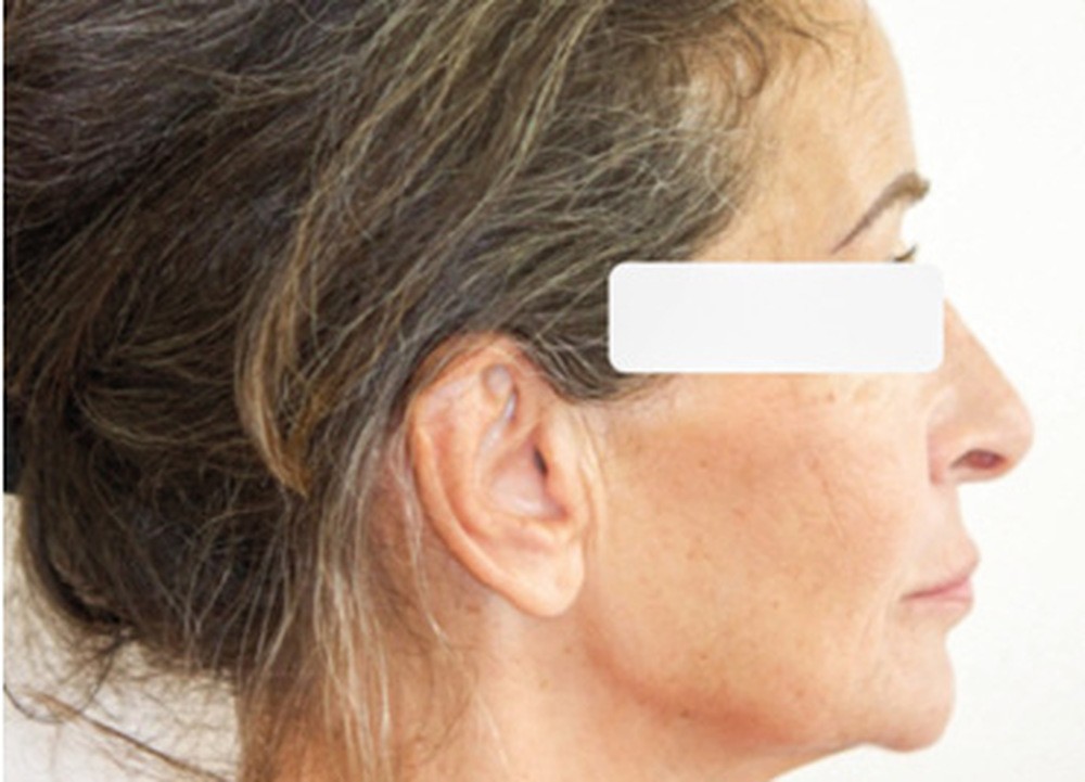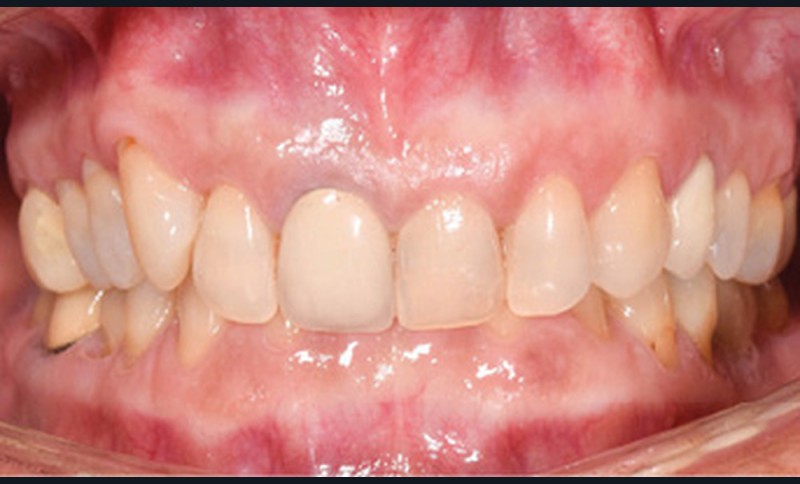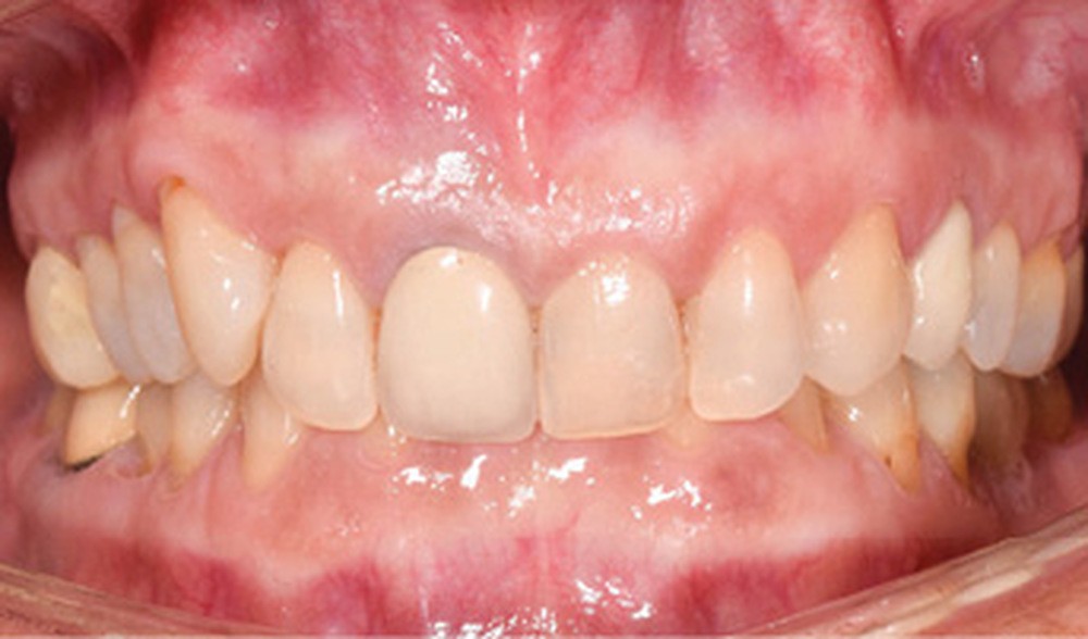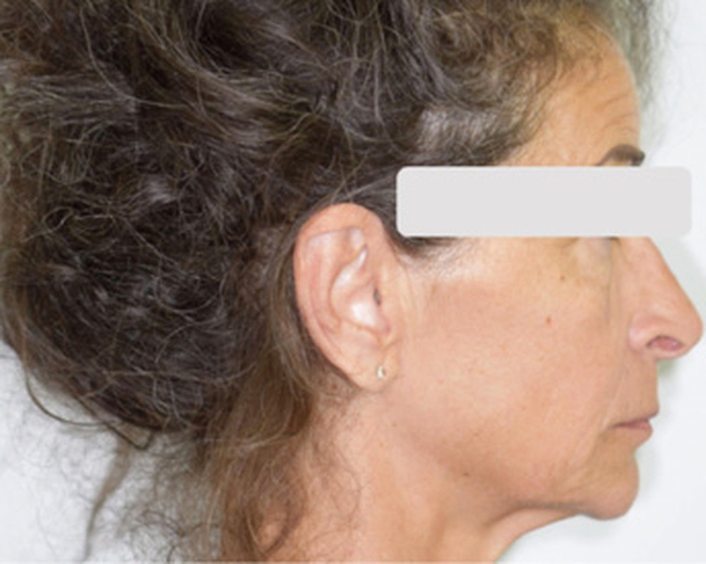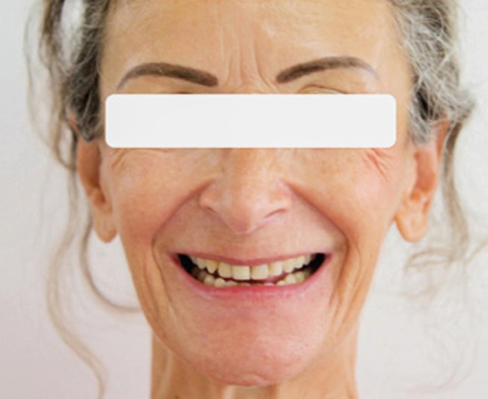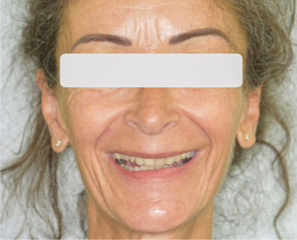 De face, la patiente a un visage de type musculaire, asymétrique avec des lèvres fines. Son profil est à tendance cis-frontal mais avec une symphyse marquée. L’étage inférieur de la face est diminué. Le sourire fait apparaître les dents maxillaires et mandibulaires. La médiane incisive maxillaire est concordante avec le plan sagittal médian.