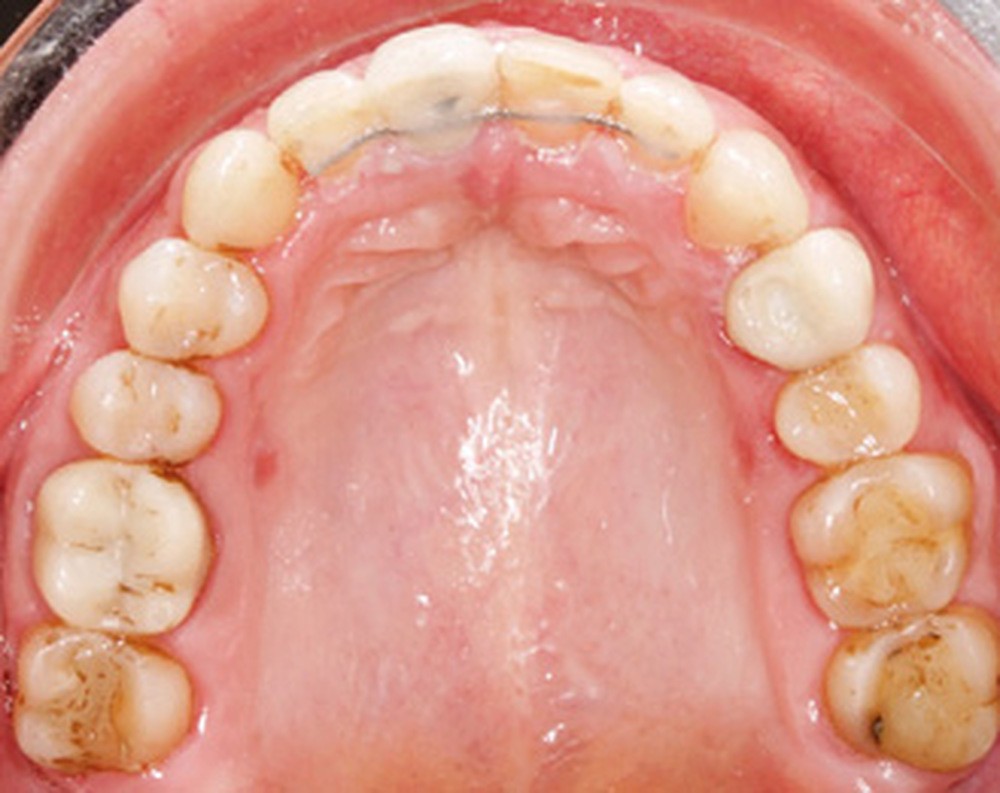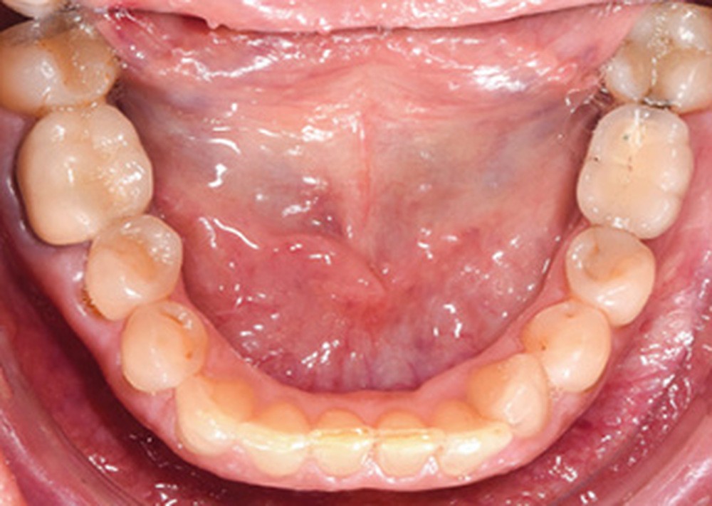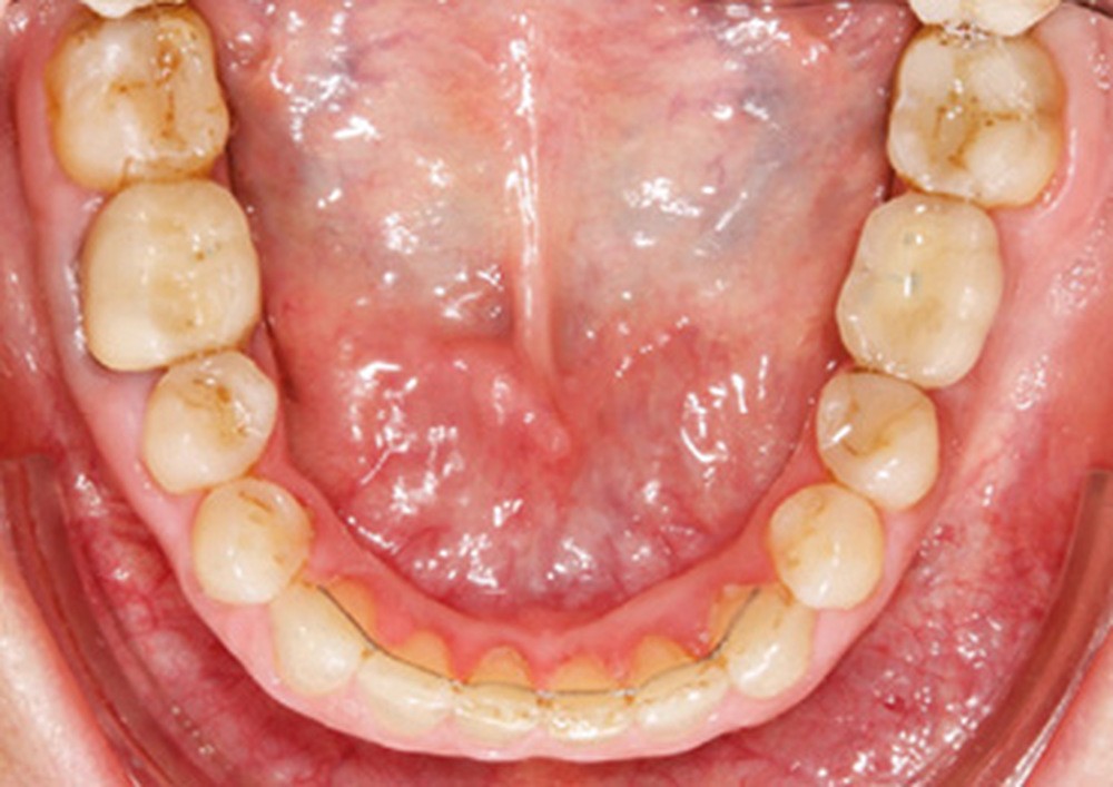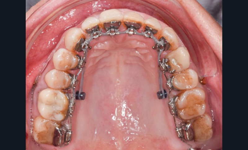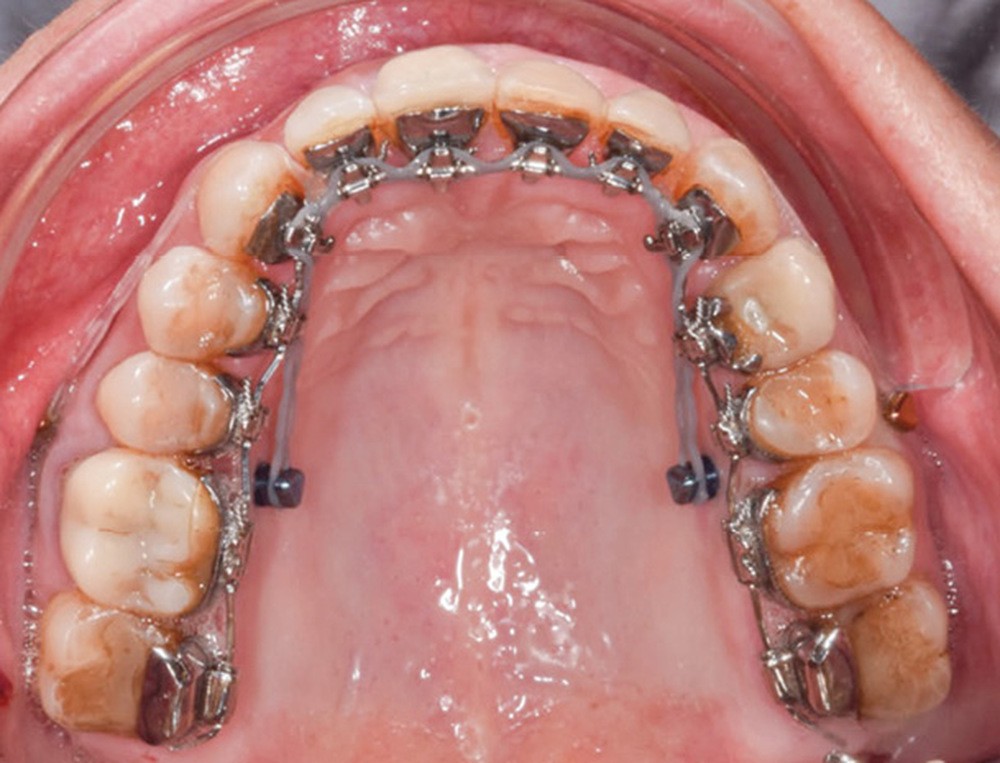 La préparation de la denture consiste en un alignement et un nivellement. En orthodontie linguale totalement individualisée, le nivellement de la courbe de Spee est facilité par la présence des bases des attaches sur les incisives maxillaires qui provoquent une égression des secteurs postérieurs et une ingression et vestibulo-version des incisives mandibulaires. L’utilisation d’arcs acier ribbonwise .016 x .024 est également efficace pour ce nivellement [3].