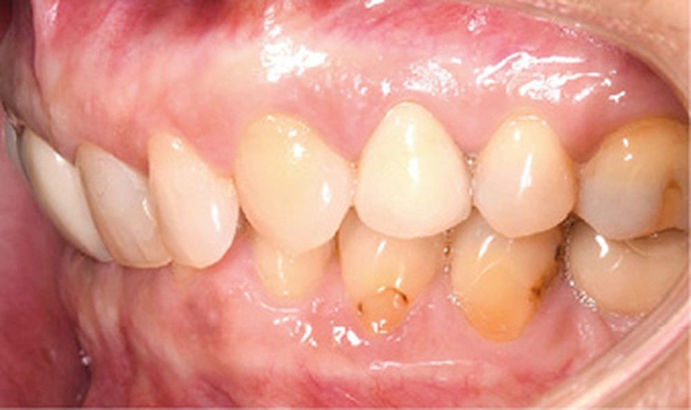 La correction de la classe II molaire et canine a été réalisée tout en maintenant les médianes incisives centrées malgré l’implant en 36.
