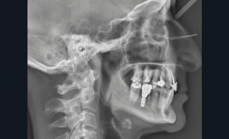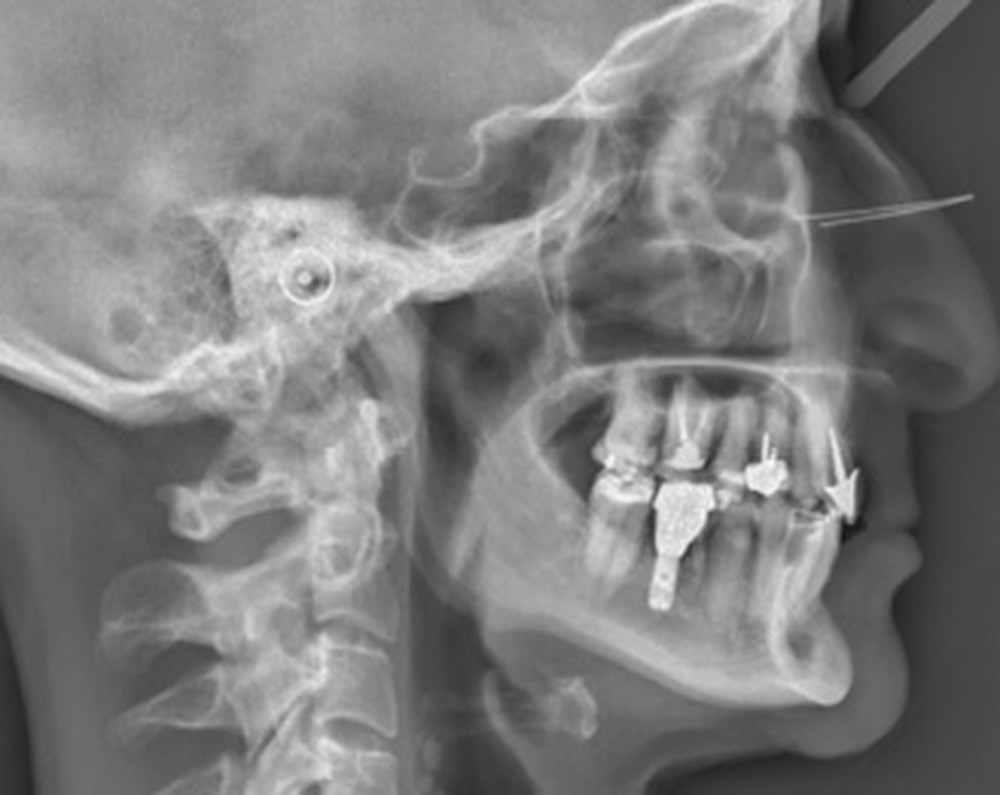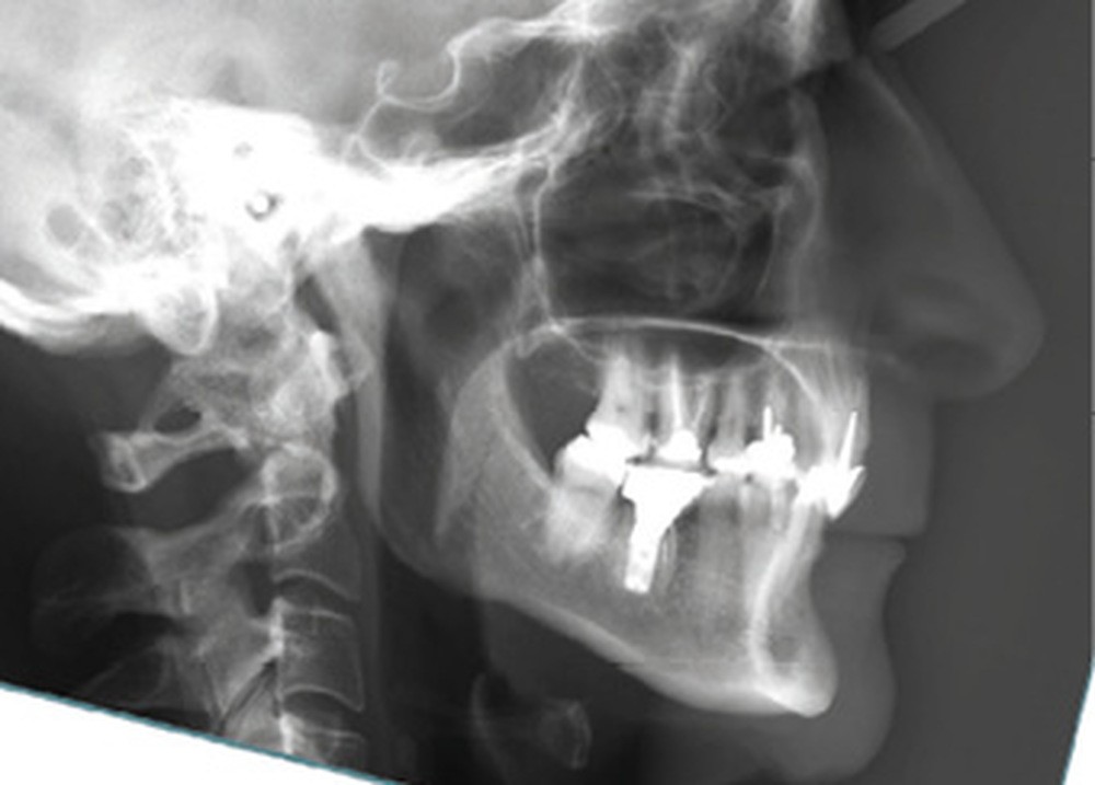 La téléradiographie de profil et l’analyse céphalométrique montrent une classe I squelettique tendance classe II dans un contexte d’hypodivergence avec diminution de l’étage masticatoire. L’axe de l’incisive mandibulaire est en normoposition, alors que l’incisive maxillaire présente une rétroalvéolie importante.