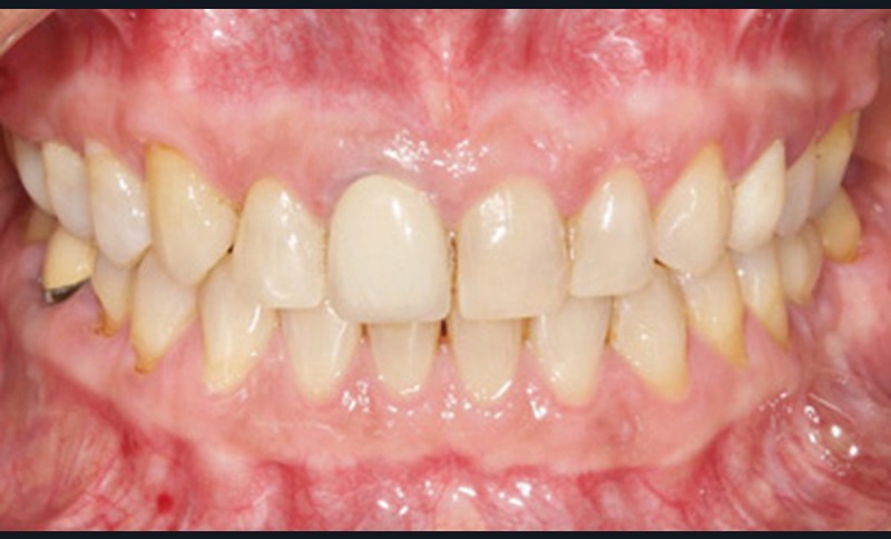 L’arcade maxillaire est asymétrique et parabolique. Elle présente une mésio-position du secteur 1. On note des rotations mésio-vestibulaire de 13 et disto-vestibulaire de 23 et une palato-version incisive. Les restaurations prothétiques sur 11, 16 et 24 semblent à refaire. L’arcade mandibulaire est asymétrique et parabolique avec une couronne sur implant en 36.