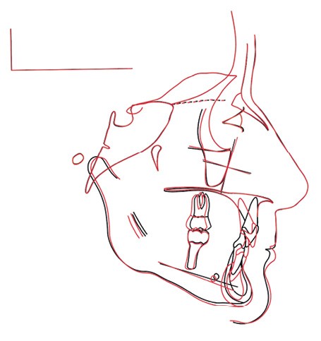 Sur la téléradiographie de profil, on note une normalisation des rapports incisifs avec un torque radiculo-palatin de l’incisive maxillaire et une vestibulo-version de l’incisive mandibulaire. La diminution de l’angle interincisif a été recherchée afin de garantir la stabilité du traitement. La superposition générale structurale révèle une rotation totale horaire qui confirme une amélioration du sens vertical.