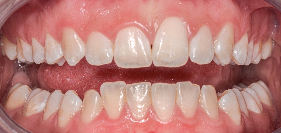 Notre choix s’est porté sur une intervention chirurgicale parodontale la moins invasive possible, en utilisant une gouttière thermoformée souple. Cette approche a permis l’amélioration objective de l’esthétique du sourire de la patiente.