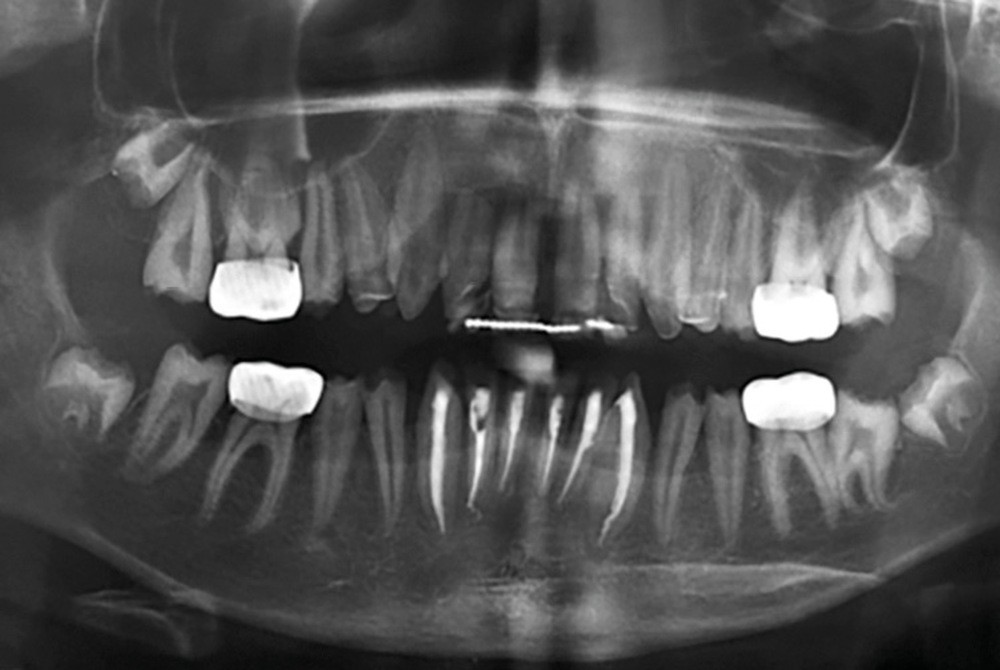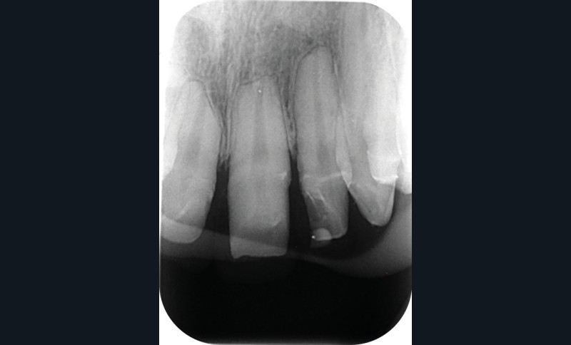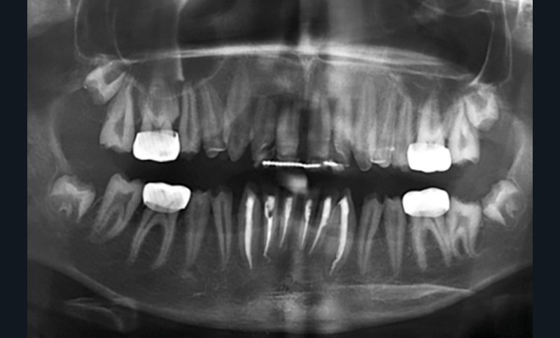 Une patiente âgée de 12 ans a été adressée au cabinet pour « une prise en charge complète sur le long terme » par son praticien traitant. Elle était accompagnée par sa mère. Elle présentait des couronnes transitoires en résine sur le secteur incisivo-canin au maxillaire ainsi que les premières prémolaires, des coiffes pédodontiques métalliques sur les premières molaires, une absence totale d’émail sur l’ensemble de la denture, à l’exclusion des bords libres des incisives mandibulaires (fig. 1 à 3). Le bloc incisivo-canin mandibulaire avait bénéficié de traitements radiculaires (fig. 4). Les incisives maxillaires présentaient des rhizalyses d’une importance significative (fig. 5 et 6). La patiente se plaignait d’hypersensibilités à la mastication et au brossage, la demande esthétique était forte.