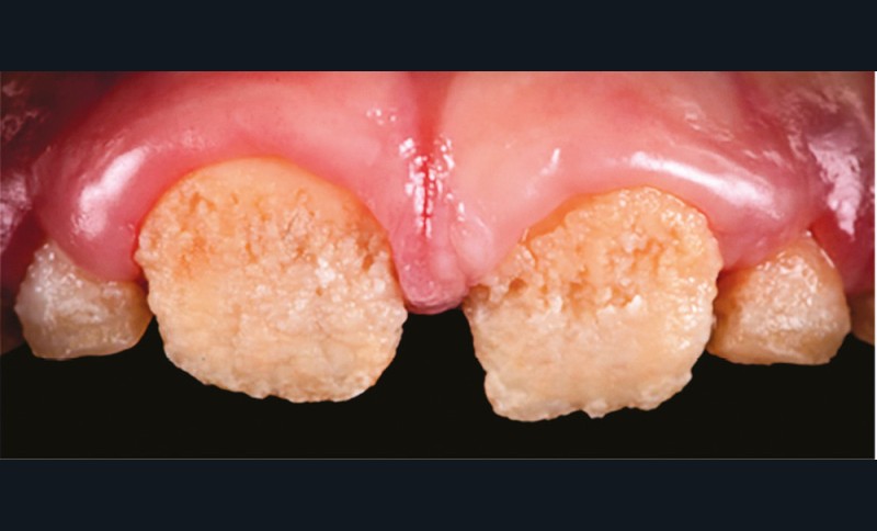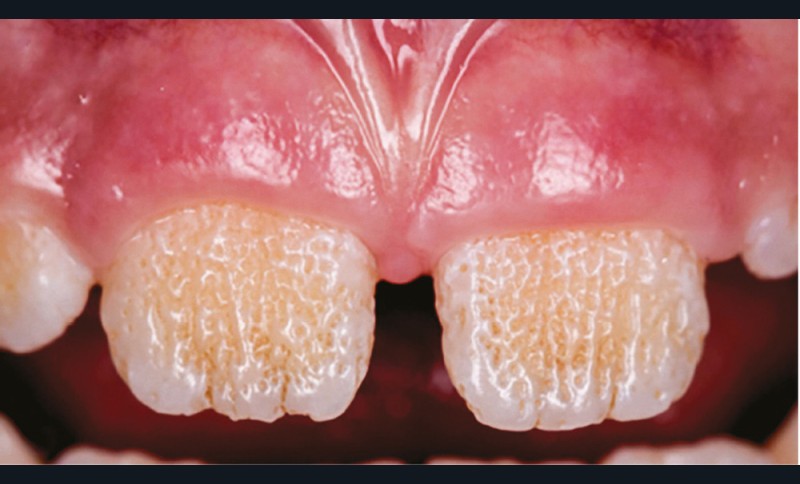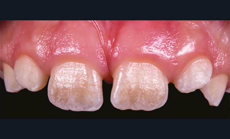 L’amélogenèse imparfaite est le nom donné à un groupe hétérogène de pathologies caractérisées par un défaut inné du développement de l’émail affectant toutes les dents des deux dentures. Ce sont des maladies génétiques dont l’origine est la mutation d’un gène impliqué dans l’amélogenèse. À ce jour, plus de 200 mutations différentes ont été identifiées, ce qui explique des phénotypes très variés [1]. Selon le stade de la maladie, l’émail est hypoplasique (défaut quantitatif), hypominéralisé, ou hypomature (défauts qualitatifs) : il est fin, fragile, tâché ou dyschromique. L’intensité des défauts peut être légère (forme frustre) ou très sévère, allant jusqu’à une absence totale d’émail. Son aspect est altéré par des dyschromies, fractures ou irrégularités de surface (fig. 1-4).