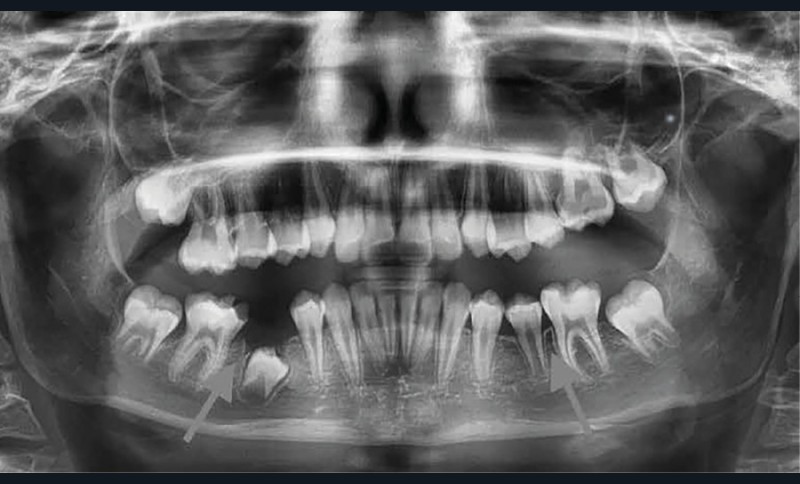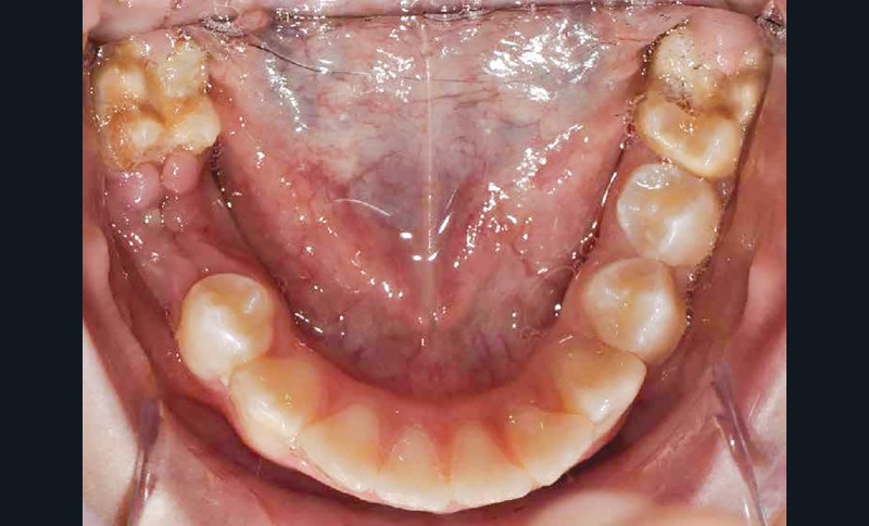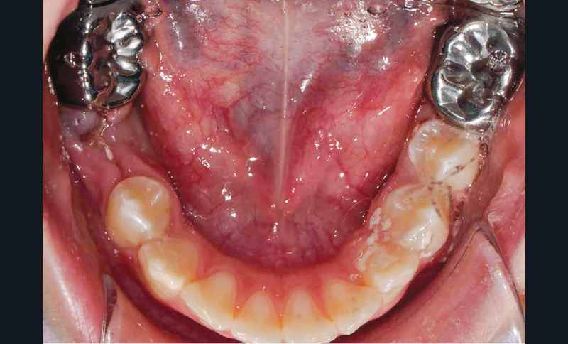 Lisa est une jeune patiente de 10 ans, atteinte d’une MIH sévère sur les premières molaires mandibulaires 36 et 46 (fig. 1 et 2). Elle présente une sensibilité exacerbée au froid en regard des zones molaires entraînant un brossage approximatif.