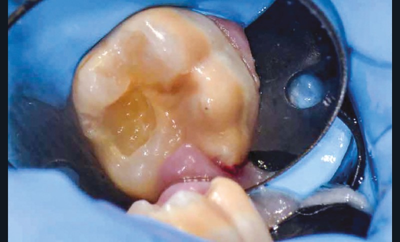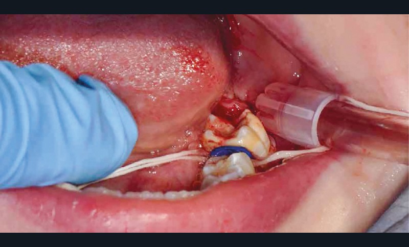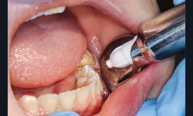 Afin d’optimiser les séances de soins, l’anesthésie intra-osseuse par injection électronique a été réalisée avec le Quicksleeper 5® dans les deux secteurs (fig. 3 et 4) afin de permettre la réalisation des coiffes préformées métalliques sur 36 et 46 dans la même séance (fig. 5 à 7). Il aurait été difficilement envisageable de réaliser les coiffes dans la même séance en utilisant une anesthésie tronculaire dans chaque secteur.