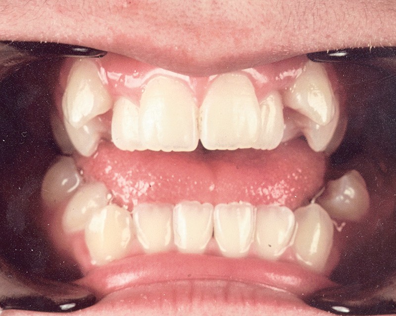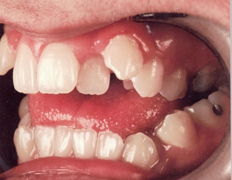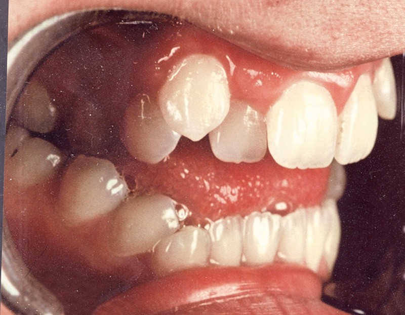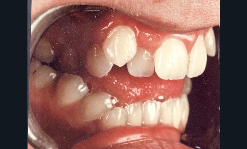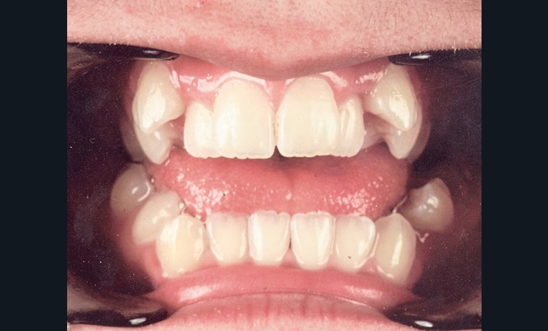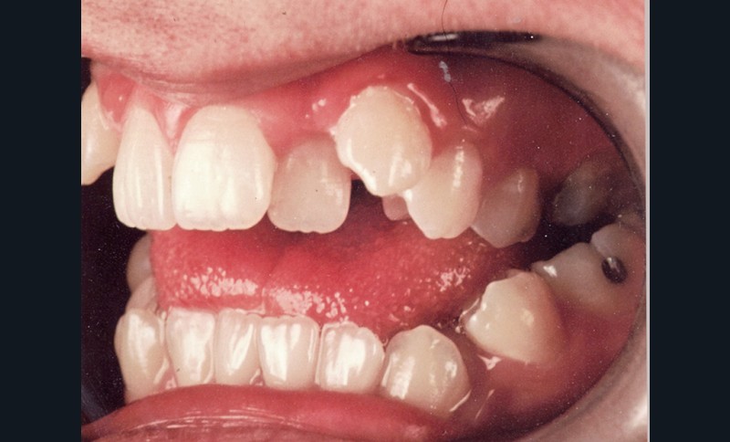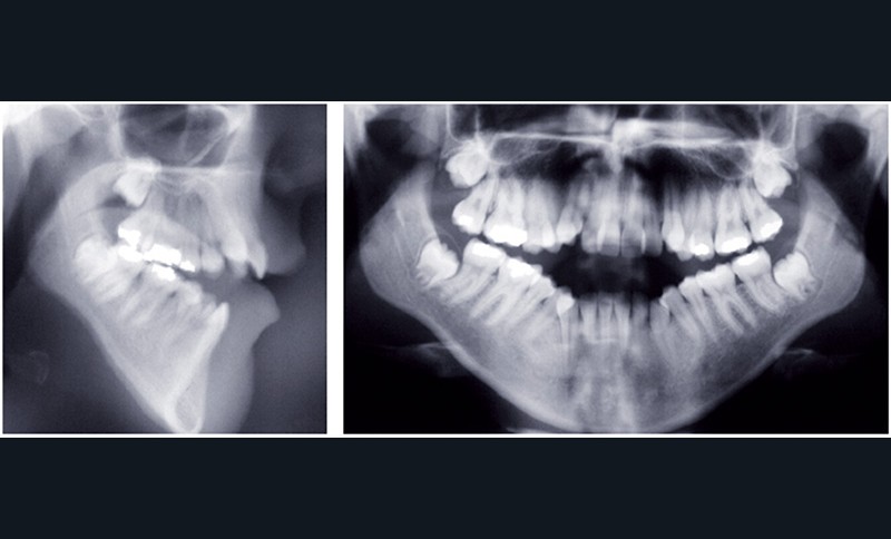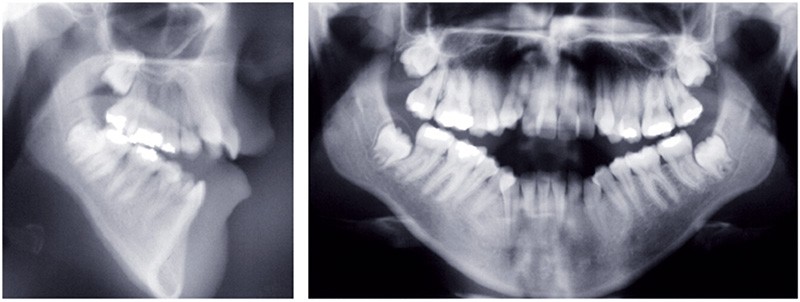 Sur le plan occlusal et dentaire, on observe une classe I molaire, une occlusion transversale en bout à bout à droite et inversée à gauche et une béance antérieure sévère s’étendant jusqu’aux molaires. Un encombrement est présent aux deux arcades avec des dystopies canines importantes (fig. 2).