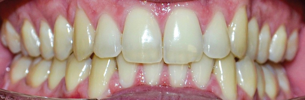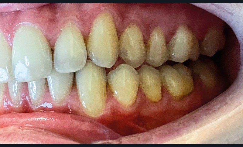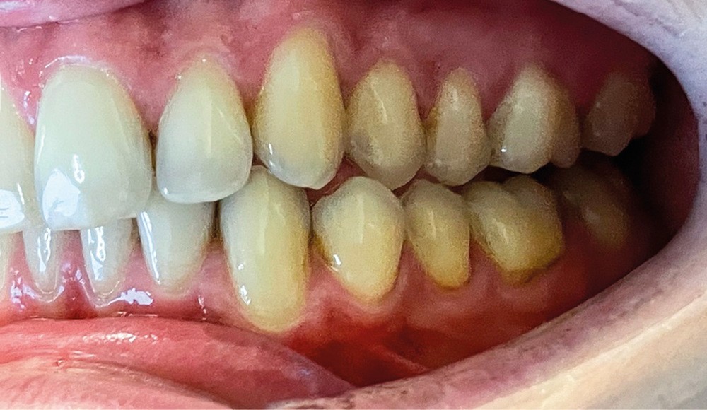 ► L’entretien semi-directif met en évidence des signes d’apparition récente (un an environ), une aggravation progressive des symptômes, et la perception rapportée par le patient de moindres contacts occlusaux du côté gauche. L’examen clinique extra-oral révèle des douleurs musculaires lors de la palpation des muscles masséters, temporaux et ptérygoïdien médial gauche ainsi que des muscles sterno-cléïdo-occipito-mastoïdiens droit et gauche. Il n’y a pas de limitations d’ouverture buccale. L’examen clinique intra-oral révèle la présence d’une inocclusion dentaire gauche, qui s’étend des dents 23 à 27 (fig. 1 et 2). Il est à noter que la reprise de l’entretien ne rapporte pas d’antécédent de soins dentaires, orthodontiques et/ou prothétiques susceptibles d’engendrer une modification de l’occlusion.