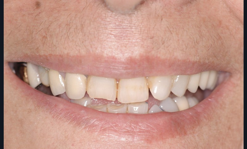 Toutefois, certaines situations sont avantageusement traitées par l’emploi de crochets à émergence cervicale, de type « Y de Roach », pour autant que la lèvre ne découvre pas le tiers cervical de la dent d’appui (fig. 4 et 5). Le recours à la prothèse fixée et aux attachements répond aux doléances esthétiques, mais présente un coût biologique important lorsque des dents saines sont préparées et requiert une parfaite maîtrise des exigences biomécaniques et des procédés de laboratoire qui y contribuent (fig. 6a-c). Au-delà de l’abord esthétique, lorsque la canine est absente, voire une ou deux incisives, se pose de surcroît le problème de l’équilibre prothétique. En effet, quel pronostic attendre lorsque ne subsistent que quelques dents antérieures promises nécessairement à la stabilisation et à la rétention d’une PAP ? (fig. 7). Naguère, une telle situation conduisait raisonnablement à indiquer la réalisation d’une prothèse complète.