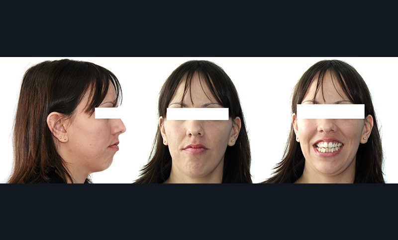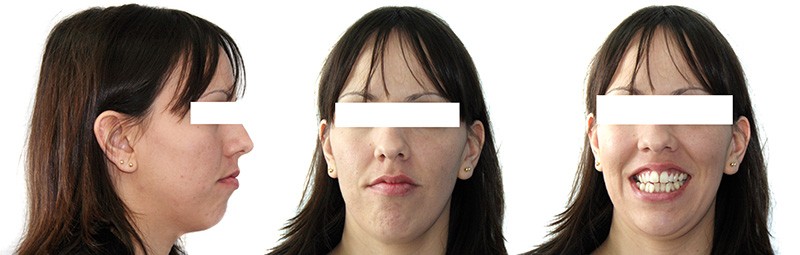 Mme M. présente une classe II squelettique par rétrognathie mandibulaire dans un contexte vertical hyperdivergent sévère se traduisant par un profil général convexe et un menton en position cis-frontale, dont les tissus mous expriment une tension importante lors de l’occlusion labiale (fig. 1 et 2). La patiente est symétrique, le sourire est gingival, même s’il n’est pas franc sur ce cliché initial (fig. 3). L’esthétique du profil et du sourire est altérée et représente un motif de consultation pour la patiente.