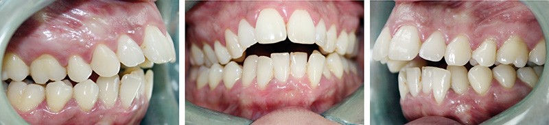 Le parodonte est fin et festonné et s’accompagne d’une légère parodontite chronique dans les secteurs molaires, chez une patiente fumeuse. On note une endognathie maxillaire ainsi qu’une béance antérieure (3 mm), d’origine squelettique, mais entretenue par une dysfonction linguale (fig. 4 à 6). La voûte palatine est profonde avec une arcade maxillaire en lyre. L’arcade mandibulaire est très asymétrique, 46 étant plus mésiale de 4,5 mm par rapport à 36, ce qui se traduit par une asymétrie de la classe occlusale et une déviation des milieux dentaires. Les extractions monomaxillaires ont conduit à une classe II molaire « thérapeutique » mais il subsiste une classe II canine avec un surplomb augmenté (6 mm).