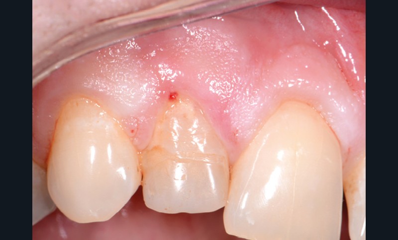6. estimation du niveau de perforation : la situation décrite ici est celle d’une perforation supra-crestale, sous-gingivale, nécessitant la réalisation d’un accès chirurgical (lambeau d’accès) ;