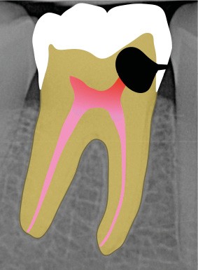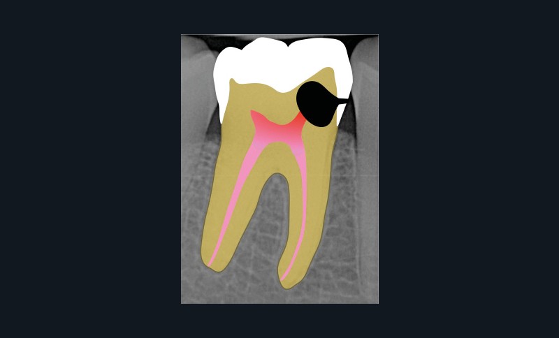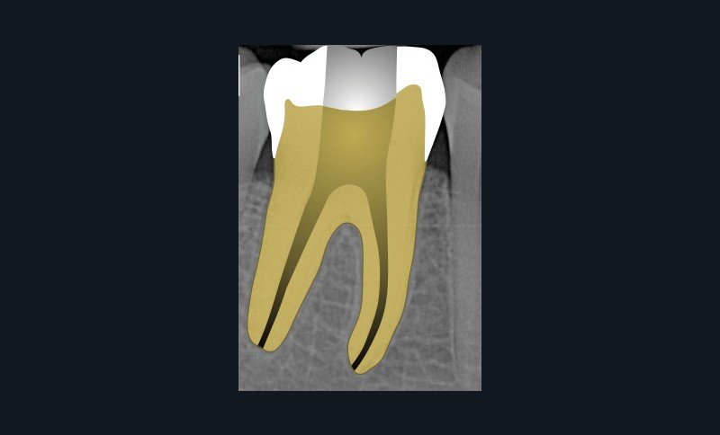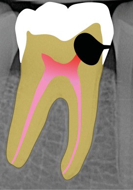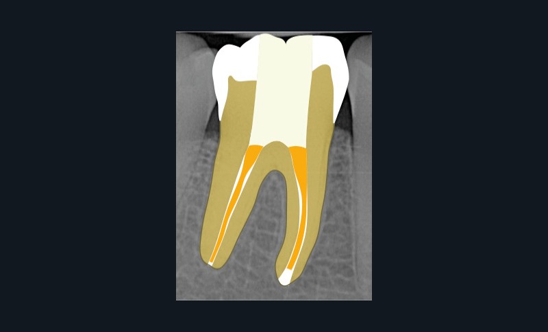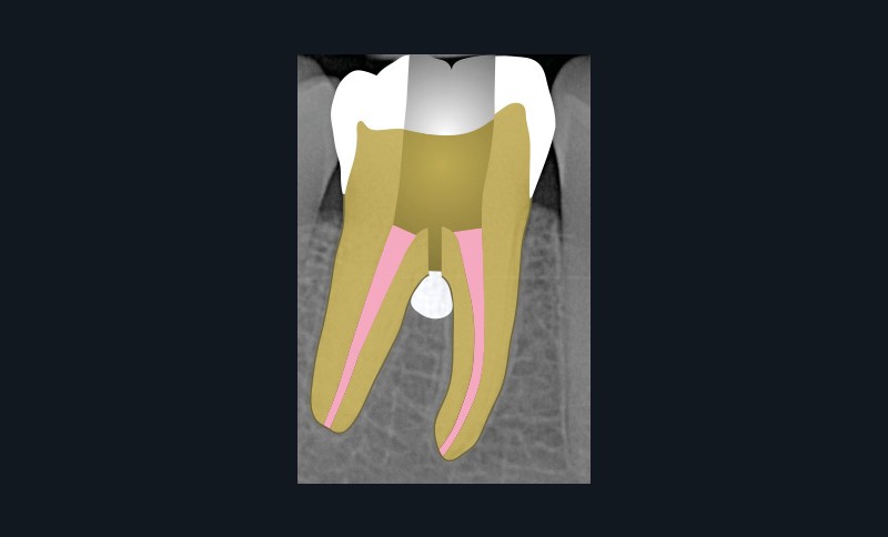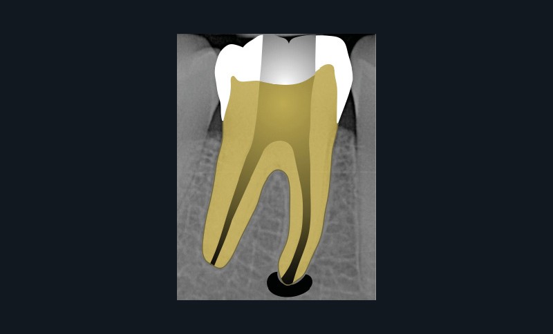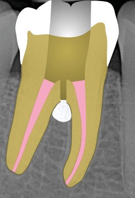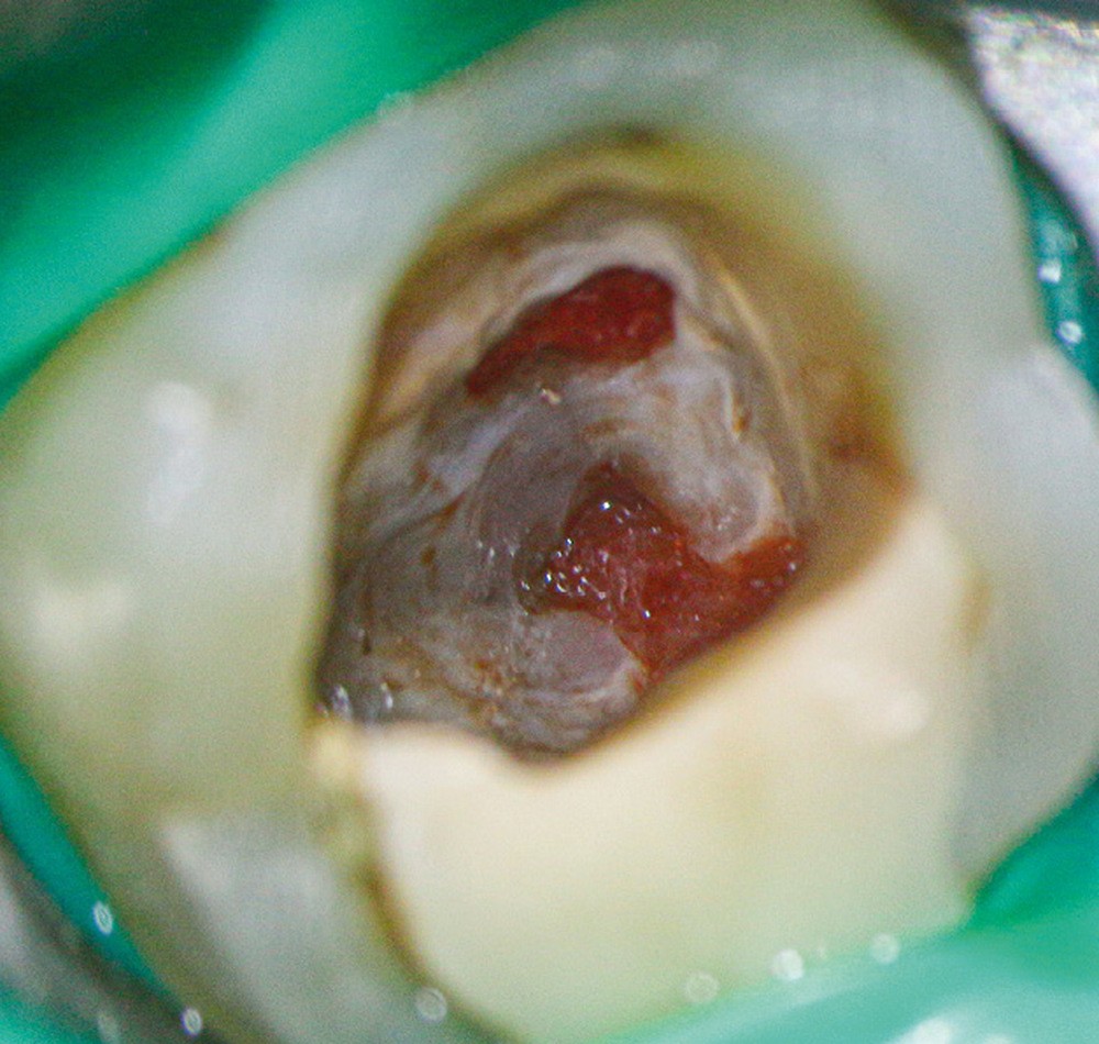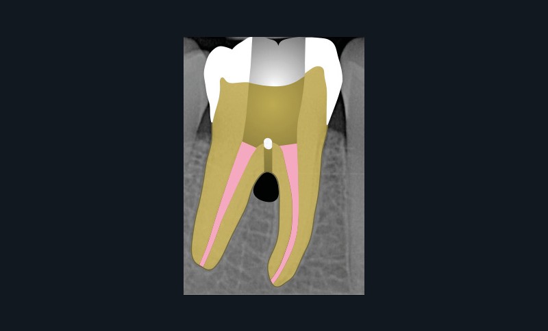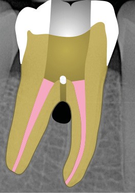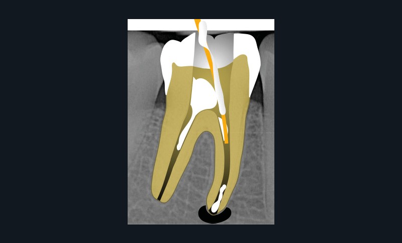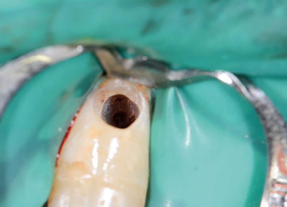 Ce type de perforation est également la plupart du temps iatrogénique et survient lors de la recherche ou de la mise en forme canalaire, lors de la préparation pour un logement de tenon radiculaire. Situées au niveau du plancher pulpaire des dents pluriradiculées, ou au niveau des entrées canalaires des dents monoradiculées ou pluriradiculées, il s’agit le plus souvent de perforations à quatre parois. Si la perforation survient en cours de traitement, elle doit être gérée immédiatement pour un meilleur pronostic (fig. 4). Néanmoins, il est important de prendre en compte l’épaisseur résiduelle du plancher. Si le plancher est trop fin, il ne sera pas possible d’envisager de traiter la perforation.