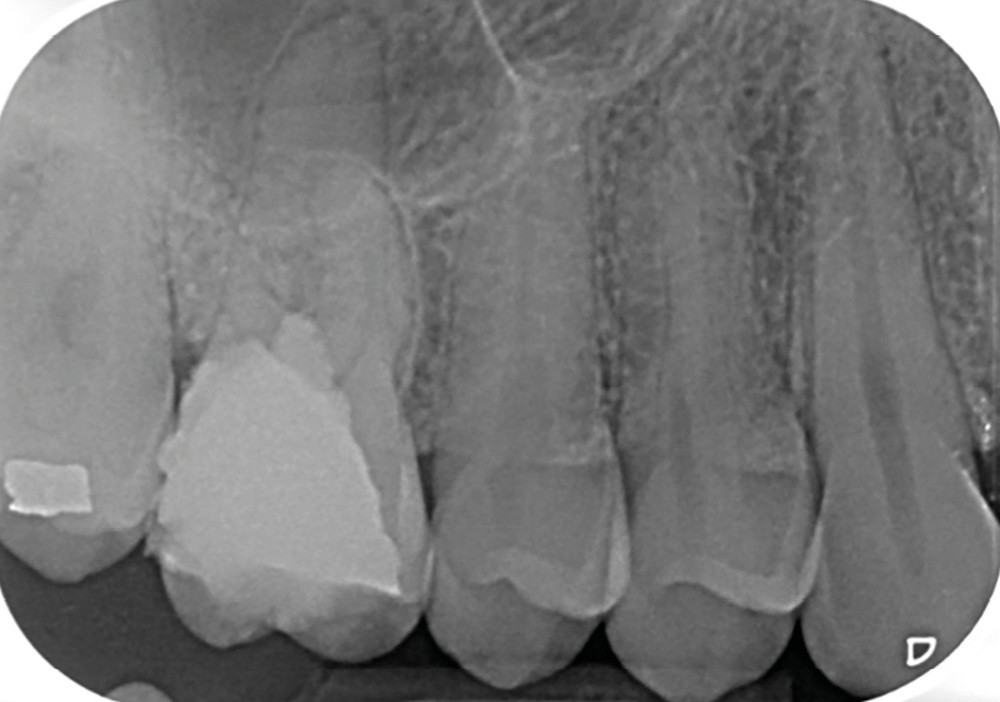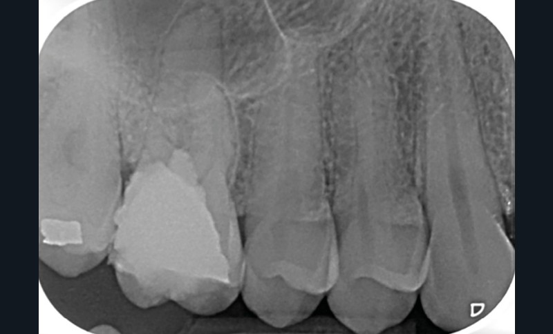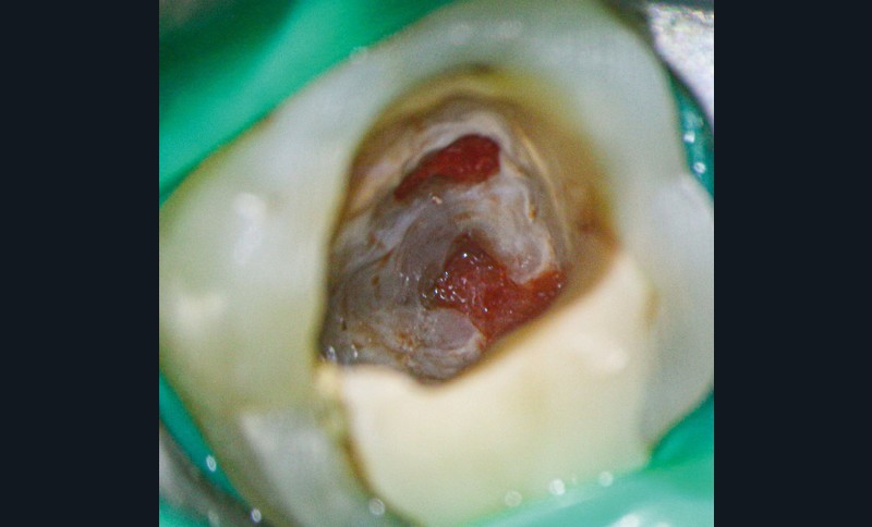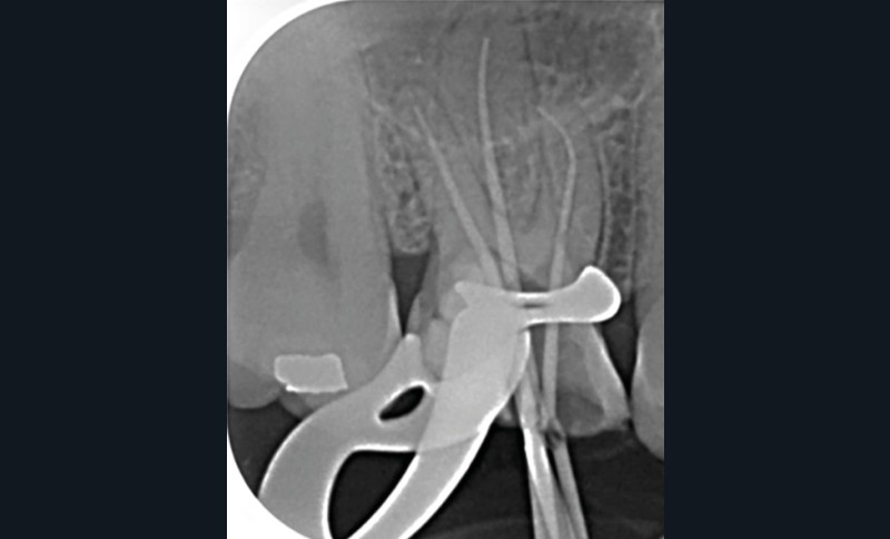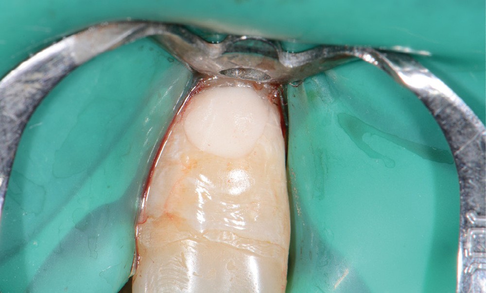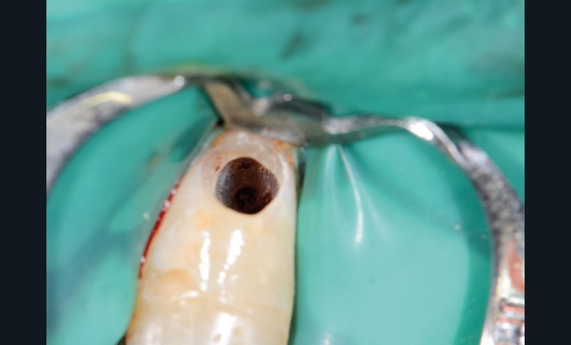 13. si possible, mise en place d’un champ opératoire sur la dent concernée, de sorte à isoler la zone de perforation de toute humidité (fig. 2) ;