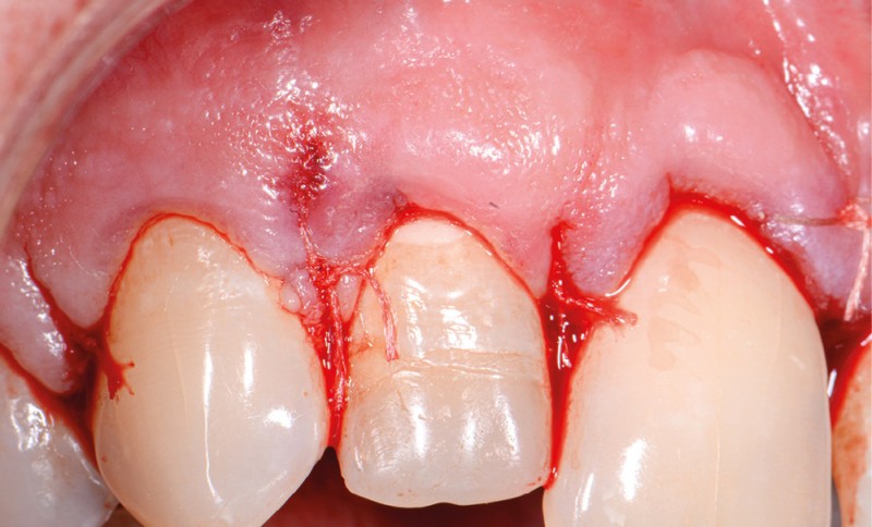 19. sutures de préférence à l’aide de fil non résorbable, diamètre fin (Ex 5/0) au niveau des papilles décollées (points simples ou matelassiers verticaux) ;