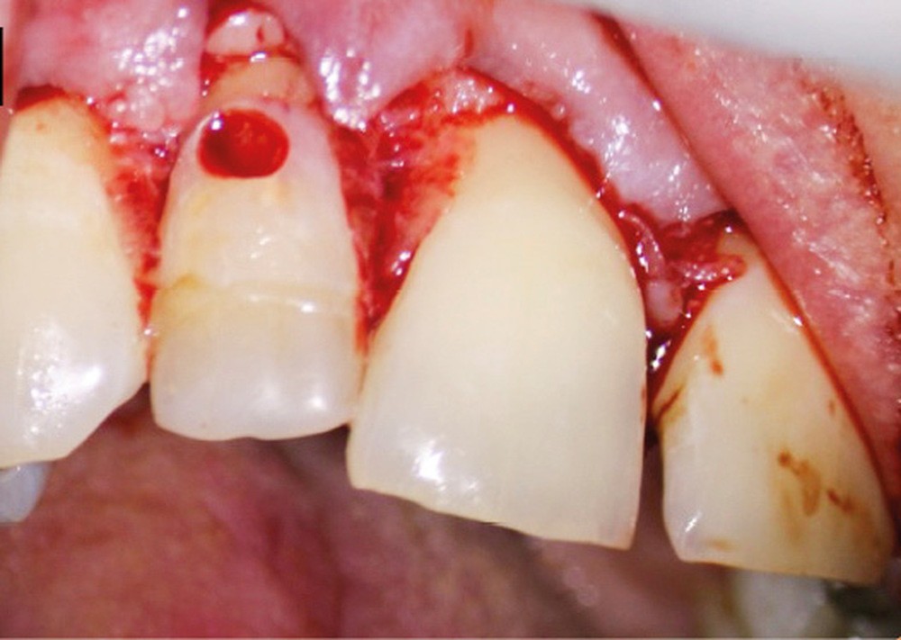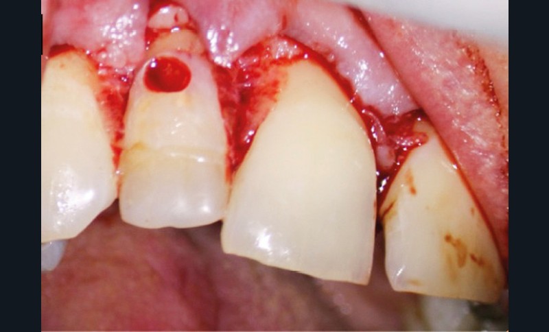 10. réalisation d’un lambeau, en commençant par l’incision intra-sulculaire à l’aide d’une lame de bistouri n° 15C, s’étendant de deux dents en mésial et distal de la dent perforée (de manière à avoir une laxité suffisante pour exposer aisément la zone de perforation – accès visuel et instrumental) ;