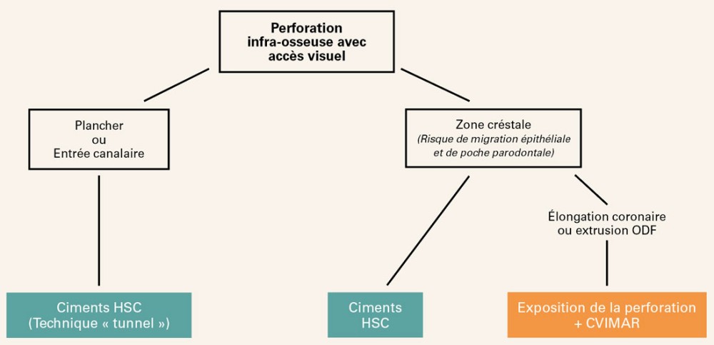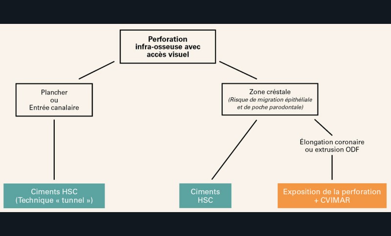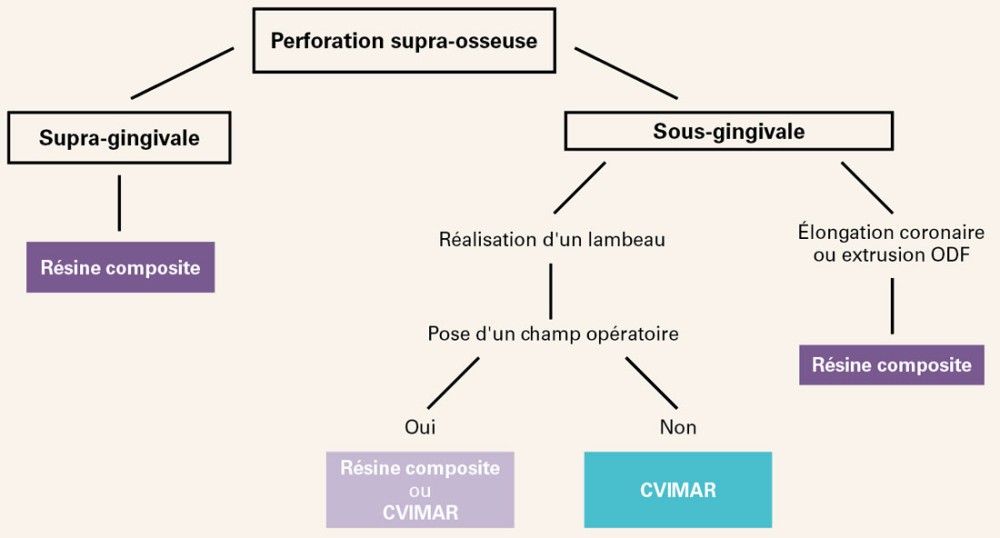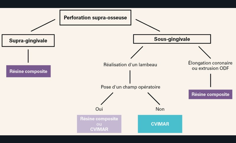 Les matériaux de choix pour ce type de perforation sont les composites ou les Ciments verres ionomères modifiés par adjonction de résine (CVIMAR).