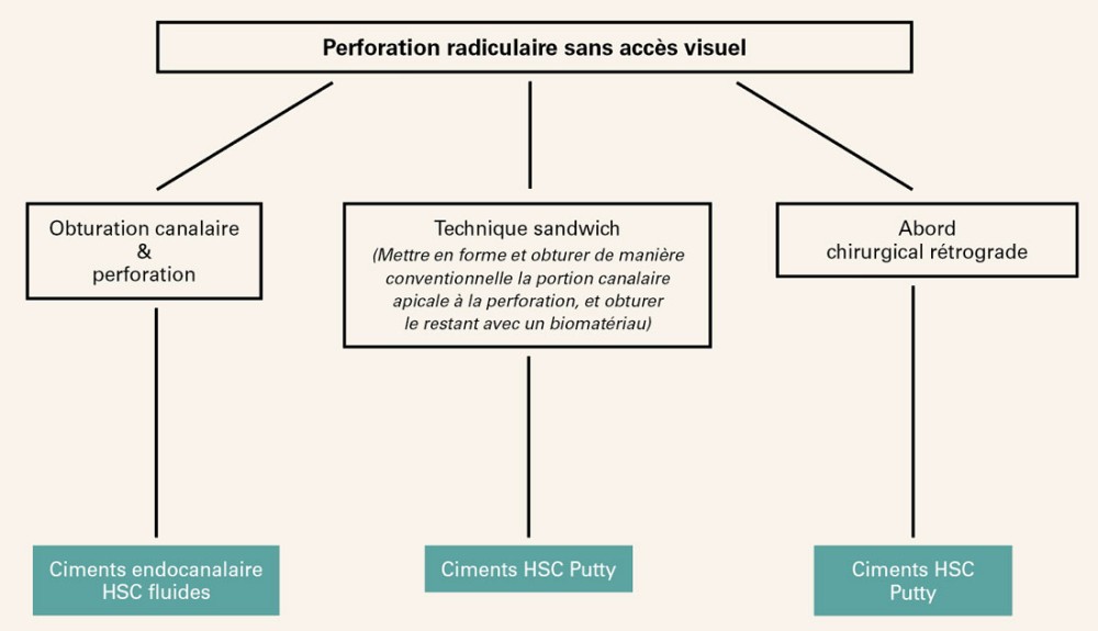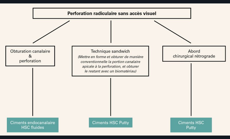 Une autre technique opératoire appelée « technique sandwich » peut être utilisée dans le cas de perforation radiculaire sans accès visuel. Une fois le glide path obtenu, et la perforation tactilement identifiée, il est possible de mettre en forme et d’obturer la portion canalaire apicale à la perforation. Le restant de la portion canalaire, comprenant la zone de perforation, peut alors être obturé avec un biomatériau type ciments HSC Putty. Cette technique est toutefois complexe à mettre en œuvre, et difficile sans accès visuel direct.