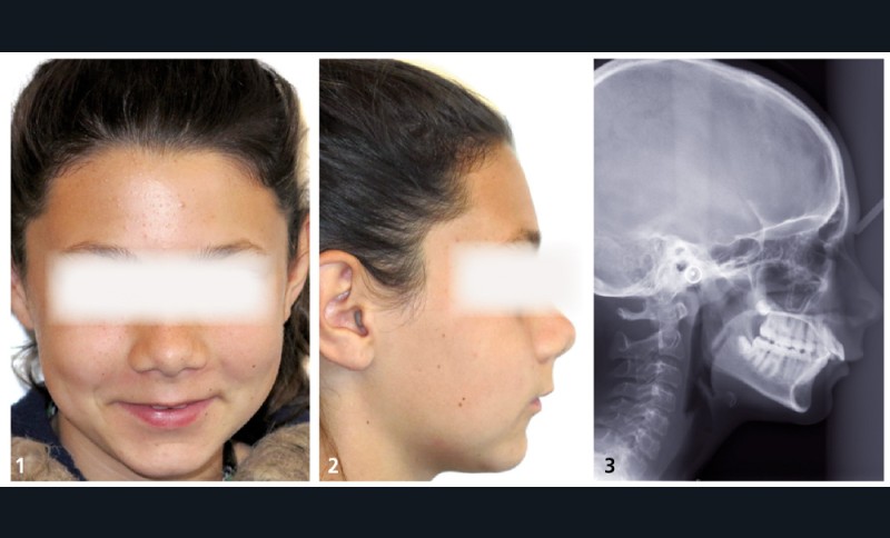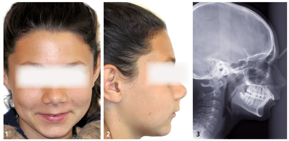 Mlle B. présente une classe II squelettique par retrognathie mandibulaire dans un contexte vertical hypodivergent. La patiente a déjà bénéficié de deux semestres interceptifs avec le port d’une force extra-orale. Le visage est symétrique, le sourire est timide et découvre peu les dents. L’angle naso-labial est ouvert, l’interposition labiale inférieure constante et la distance cervico-mentonnière réduite (fig. 1 à 3).