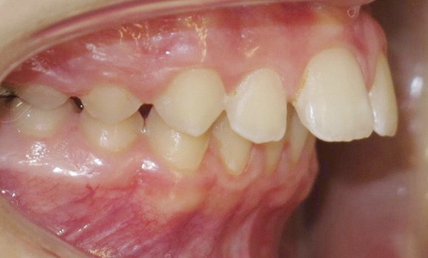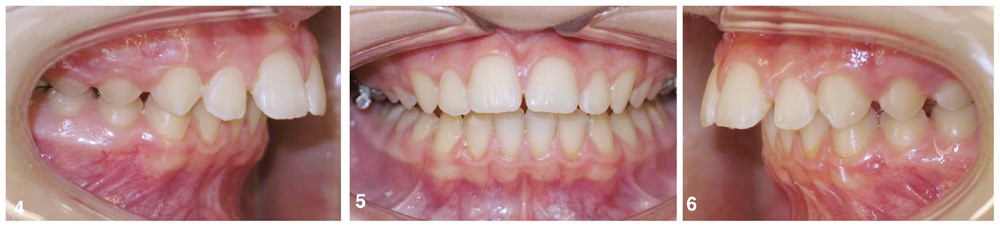 Le parodonte est fin et festonné mais l’hygiène est maîtrisée. On retrouve une endoalvéolie maxillaire relative à la classe II, une supraclusion incisive d’origine mandibulaire, une biproalvéolie incisive, un surplomb incisif de 9 mm associé à une classe II dentaire sévère (fig. 3 à 6).