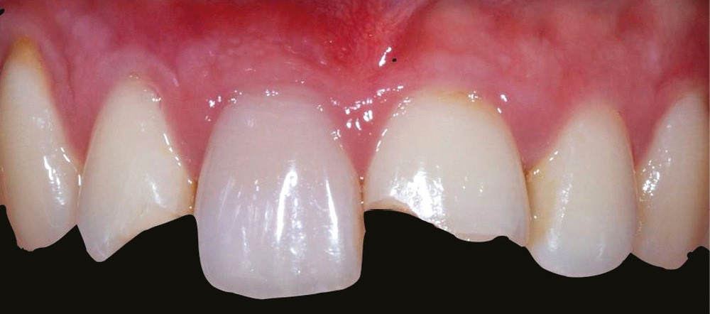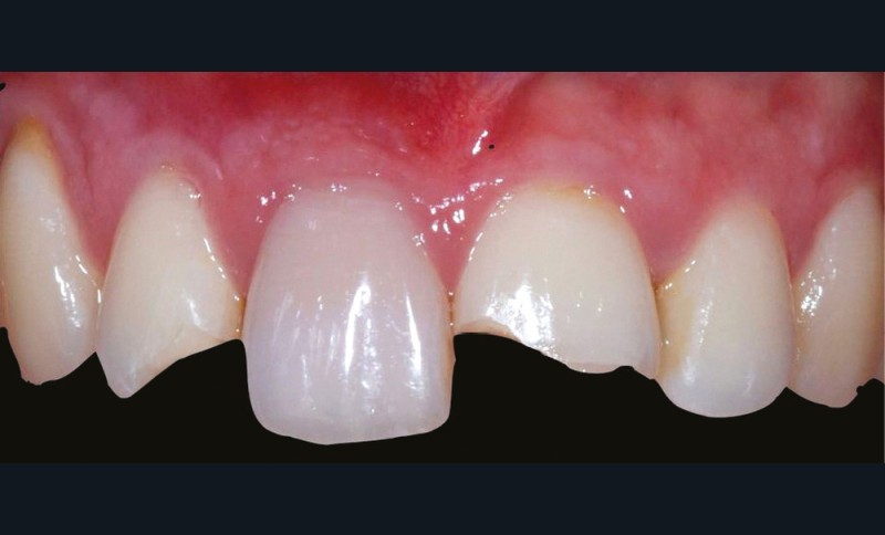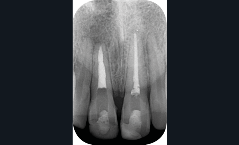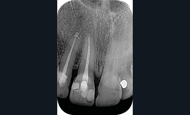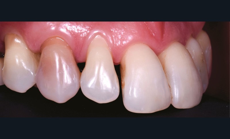 Parmi les agents responsables de cette dyschromie, on peut citer l’eugénol, contenu dans les ciments ZoE et l’oxyde de bismuth, utilisé comme radio-opacifiant dans certaines biocéramiques, et principalement le MTATM [9]. L’oxyde de bismuth, quelle que soit sa concentration, même modérée dans le cas du MTA WhiteTM, provoque une coloration iatrogène de la dent en quelques semaines seulement [10] (fig. 6) [10]. Afin d’éviter ce type de dyschromies en secteur esthétique, il s’agit donc de privilégier dans notre pratique des biocéramiques qui contiennent un autre radio-opacifiant tel que l’oxyde de zirconium qui, lui, ne va pas créer de coloration iatrogène (BiodentineTM, TotallfillTM ou le BioRootTM) [11].