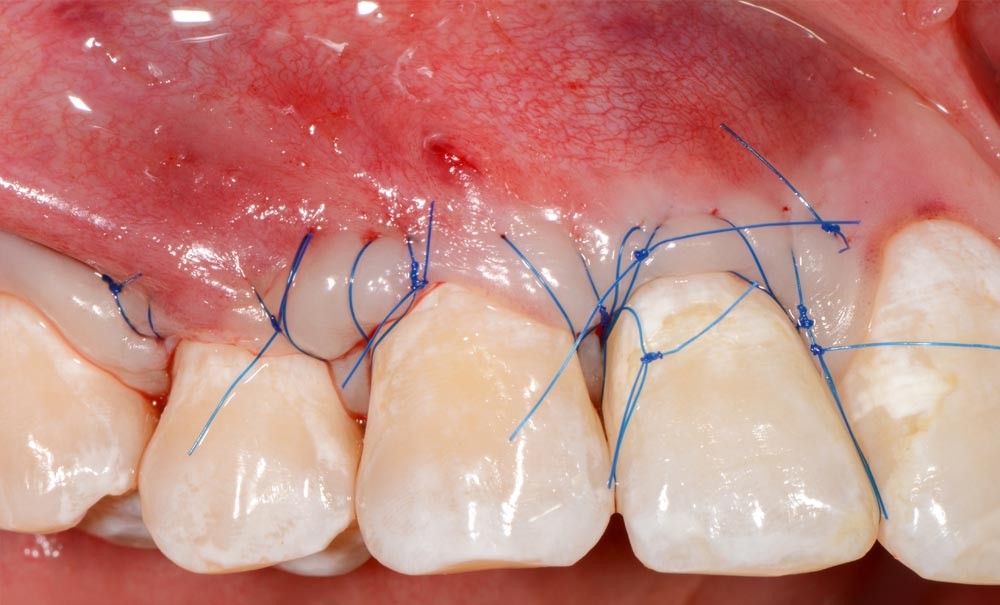 Un greffon conjonctif est positionné directement sur la racine exposée et fixé aux surfaces sous-jacentes à l’aide d’une colle tissulaire, sans faire de sutures. Étant donné que la majeure partie du greffon est placée à l’intérieur de l’« enveloppe », cela lui procure une bonne protection, une stabilité et un apport vasculaire suffisant en provenance des tissus environnants. Dans une étude rétrospective, Rossberg et coll. [2] ont évalué les résultats à long terme, à la fois cliniques et esthétiques, pour le patient après le traitement de récessions unitaires avec la technique de l’enveloppe associée à une GTCE. Les examens cliniques de réévaluation effectués entre 6 et 22 ans (moyenne : 11,4 ± 5,4 ans) montrent un recouvrement radiculaire moyen de 89,7 % ± 25,1 %, alors que le recouvrement complet des défauts est de 82 % (c’est-à-dire chez 32 patients sur 39).