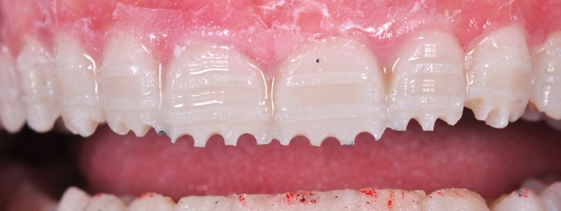 Dans les cas d’usure, le repositionnement des futurs bords libres des 2 incisives centrales par ajout de composite à main levée…
