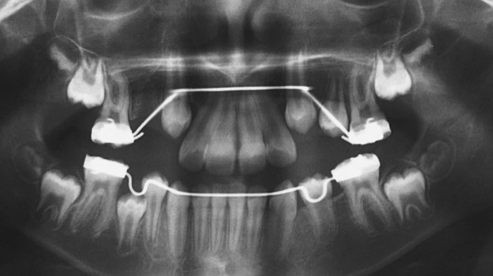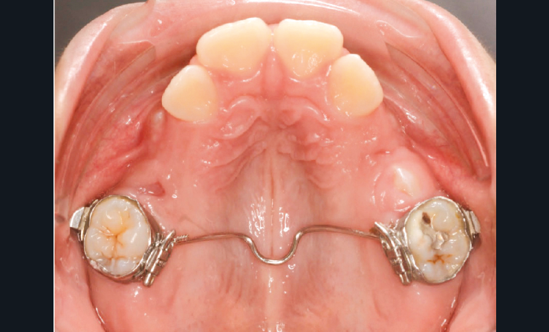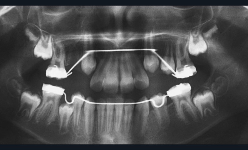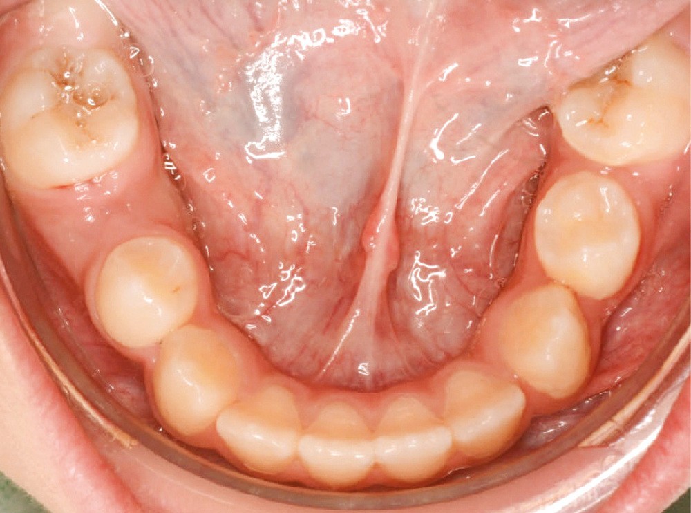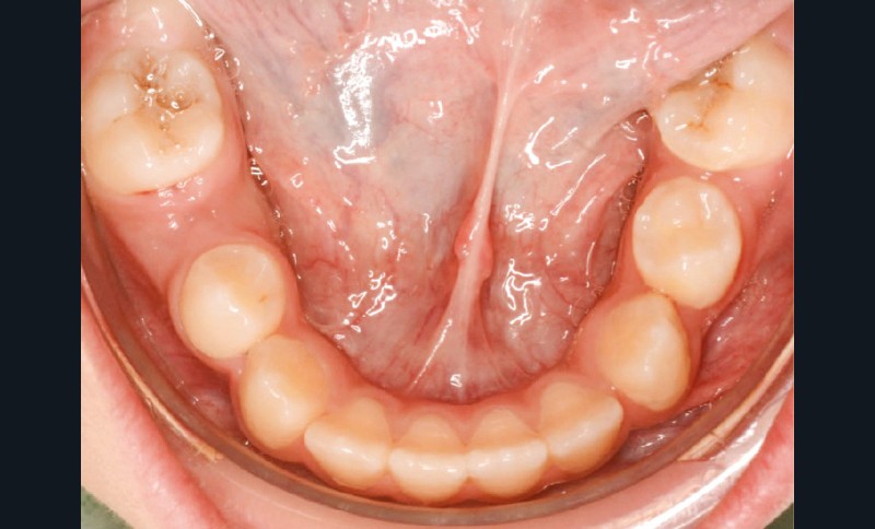 Lina, 8 ans et 5 mois, nous est adressée en consultation d’orthodontie dans le service de médecine bucco-dentaire de l’Hôpital Bretonneau en transfert avec absence des 2 prémolaires du secteur 1, alors que 44 et 45 sont présentes et que cette dernière manque de place pour faire son évolution sur l’arcade (fig. 1 et 2).