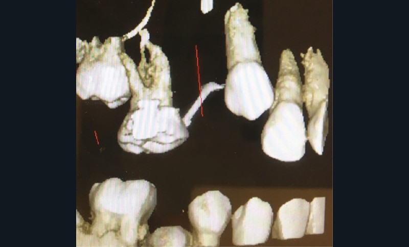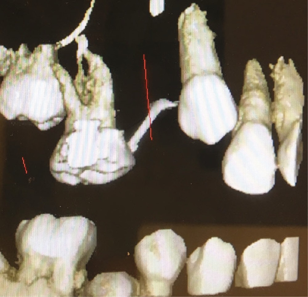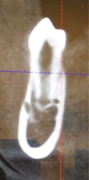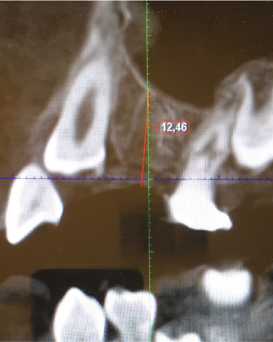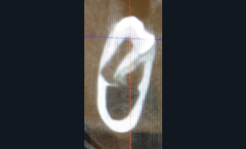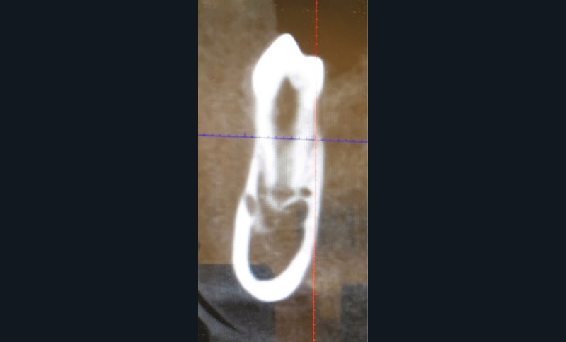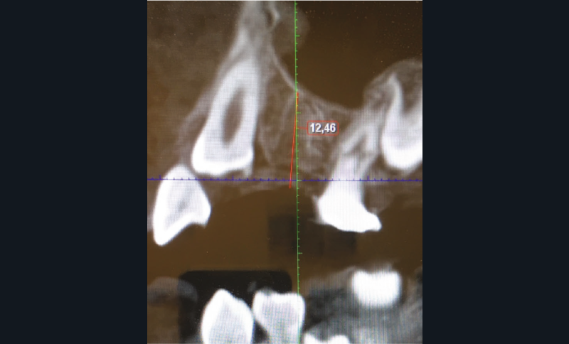 Un bilan radiologique 3D (Cone Beam CT) est prescrit dans le but d’évaluer, avec l’équipe de chirurgie du Dr Jean-Luc Charrier (Hôpital Bretonneau), la possibilité de transplantation d’une prémolaire du secteur 4 vers le secteur 1 et de définir le meilleur transplant possible entre 44 et 45. Sont analysées les dimensions du site receveur ainsi que l’anatomie, la position et l’état de maturation radiculaire des prémolaires candidates à la transplantation (fig. 3).