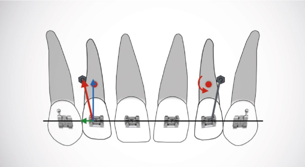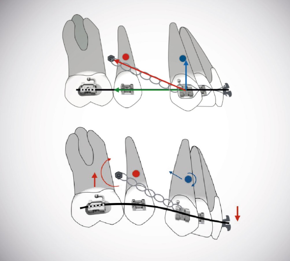 Pourquoi ? La traction directe des chaînettes élastomériques crée un vecteur de traction oblique en direction gingivale et distale.