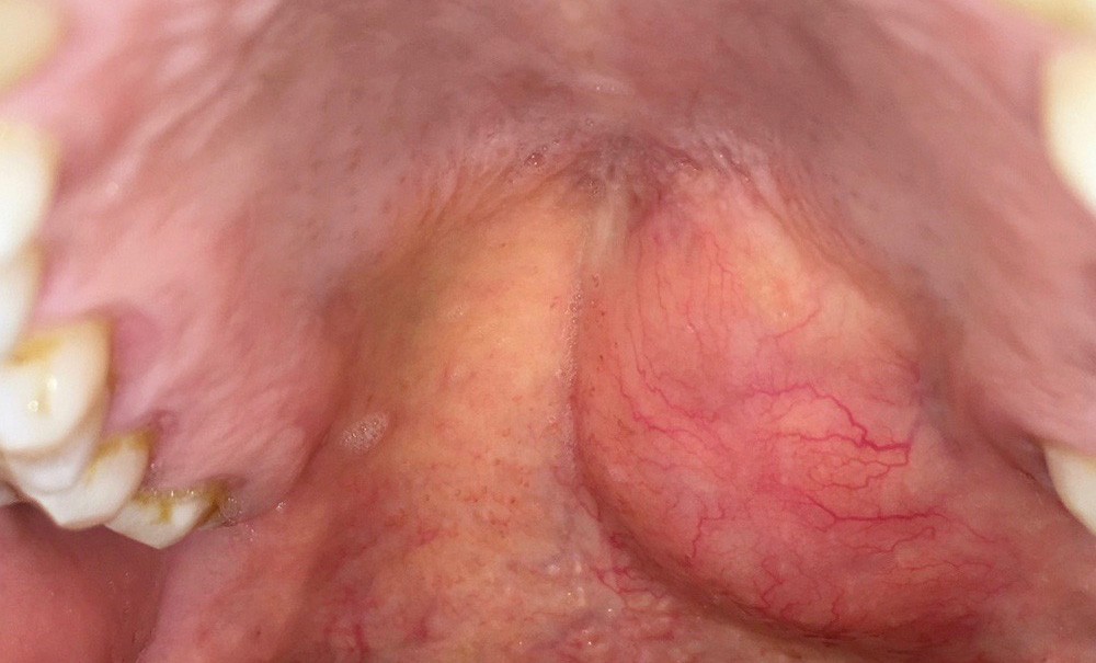 L’hypothèse principale est l’adénome pléomorphe par ses caractéristiques cliniques et fonctionnelles. Les adénomes pléomorphes représentent plus de 50 % des tumeurs parotidiennes et 80 % des tumeurs épithéliales bénignes. Elles s’observent à tout âge, avec un maximum de fréquence entre 30 et 60 ans et une fréquence accrue chez la femme jeune [1]. C’est une tumeur à faible risque de transformation maligne (8 %), la plus fréquemment retrouvée dans les glandes salivaires principales (parotides et submandibulaires). Les glandes salivaires accessoires (GSA) sont atteintes dans 10 % des cas, avec une prédominance palatine (54 % des tumeurs des GSA) [1, 2]. Les lipomes sont d’évolution plus lente, de consistance molle et de teinte jaunâtre. Le carcinome adénoïde kystique se présente comme une tumeur à croissance lente comme l’adénome pléomorphe ; parfois ulcérée et douloureuse [3]. L’aspect lisse de la lésion, son délai d’apparition et l’absence de douleur permettent d’écarter la sialométaplasie nécrosante. Le mucocèle palatin est exceptionnel et d’aspect typique (couleur bleutée) [4].