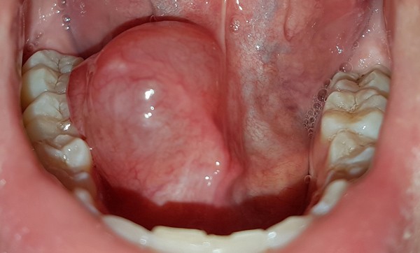 La lésion décrite est en faveur d’un kyste mucoïde du plancher buccal (syn. ranula ou grenouillette). En effet, la tuméfaction est d’apparition rapide, d’aspect lisse, bleutée, avec des antécédents de fluctuations [1]. Les kystes mucoïdes du plancher buccal peuvent prendre leur origine dans une glande salivaire accessoire ou se développer directement à partir de la glande sublinguale. Le développement peut se faire par extravasation ou par rétention salivaire.