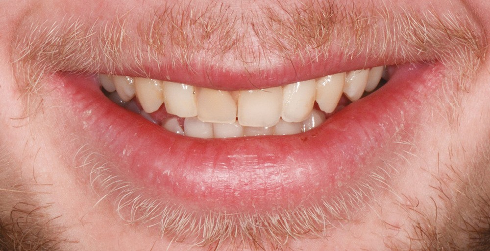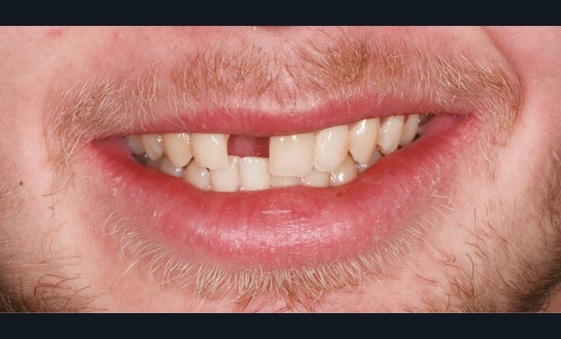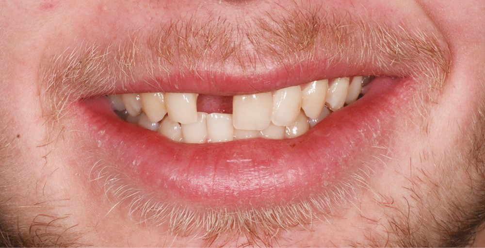 Un patient âgé de 23 ans se présente en consultation pour une réhabilitation implantaire pour la 11. Cette dent a été extraite il y a six ans par un confrère à la suite d’un traumatisme. Une prothèse amovible partielle en résine a été la solution de temporisation choisie (fig. 1a-b). Après quelques années d’usage, le patient rapporte un manque de confort et n’est pas satisfait du rendu esthétique.