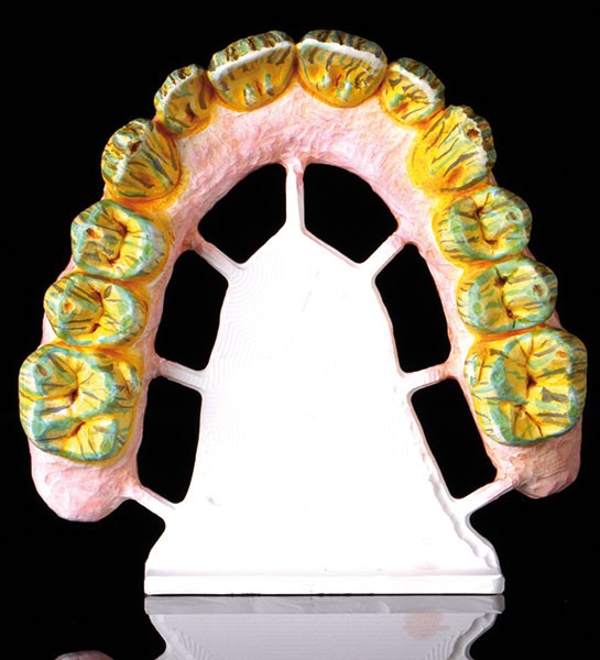 Dans cette article, nous avons planifié et réalisé une réalisation prothétique de type bridge complet, sur quatre implants. Nous avons conçu des coiffes télescopes sur chaque implant, pour permettre au patient d’enlever lui-même sa restauration, pour l’entretien et le nettoyage (fig. 1).
