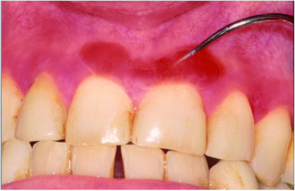 Depuis 18 mois, présence d’une inflammation de la fibro-muqueuse gingivale, principalement vestibulaire, qui évoluait de façon cyclique.