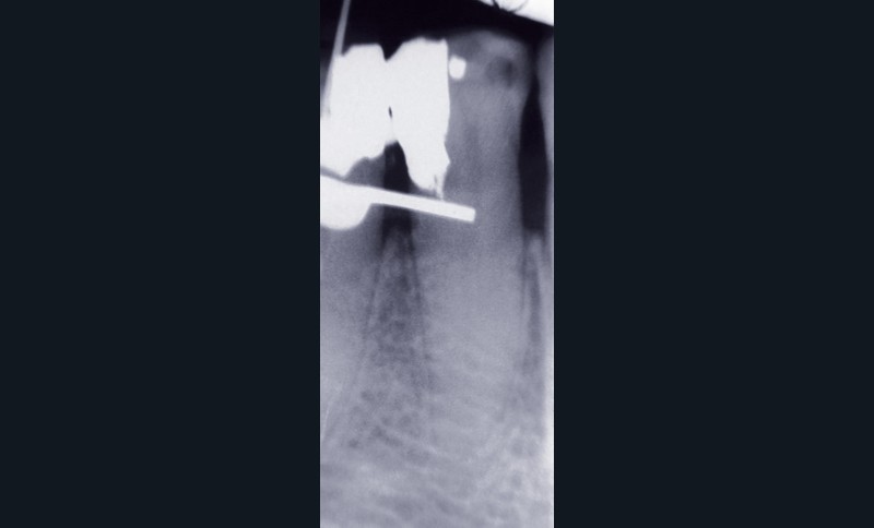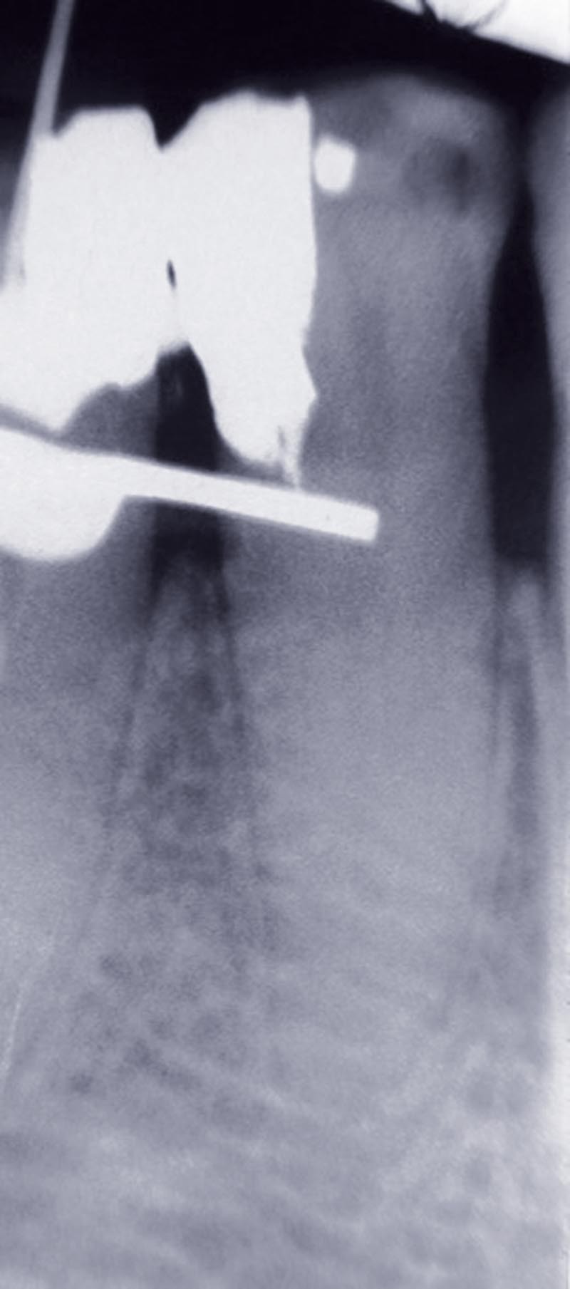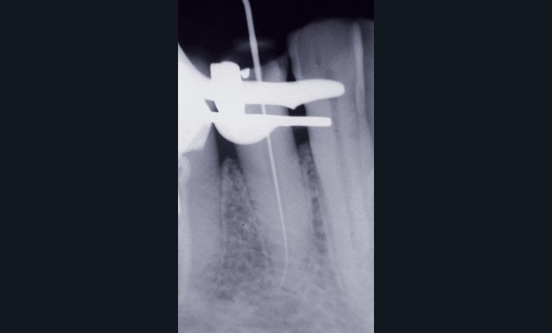 Madame RR, âgée de 67 ans, en bonne santé générale, nous consulte pour une gêne importante lors de la mastication, qu’elle situe au niveau de la première prémolaire mandibulaire droite. L’historique du cas révèle que cette dent avait été traitée en première intention voici quatorze ans par nous-mêmes pour des raisons prothétiques (pulpectomie prothétique) (fig. 2 et 3).