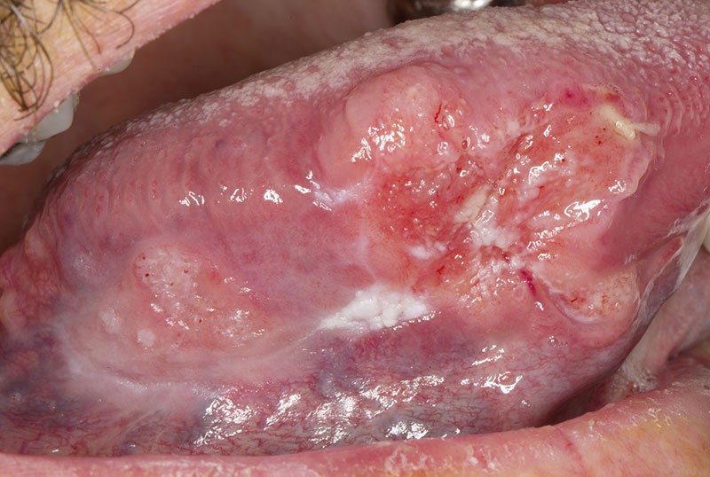 L’ulcération, caractéristique du carcinome épidermoïde, est non douloureuse, présente des bords réguliers surélevés, éversés, de consistance ferme.