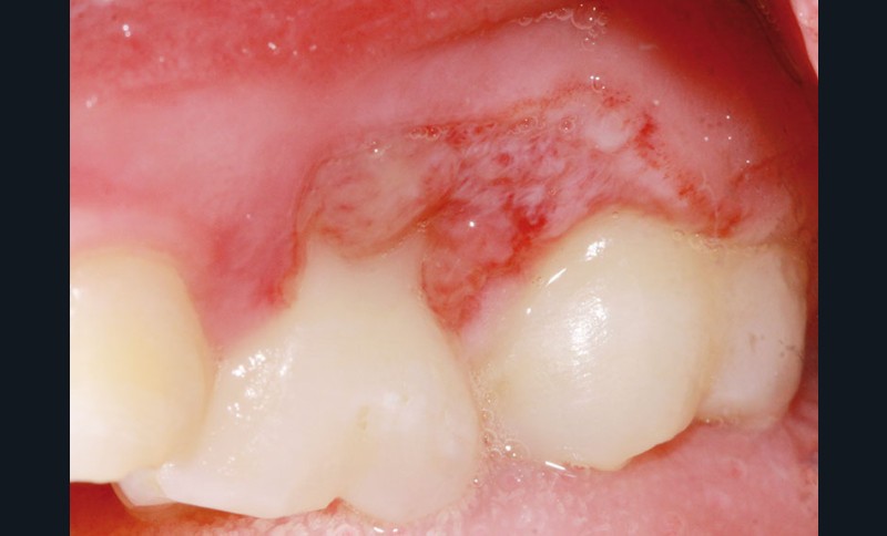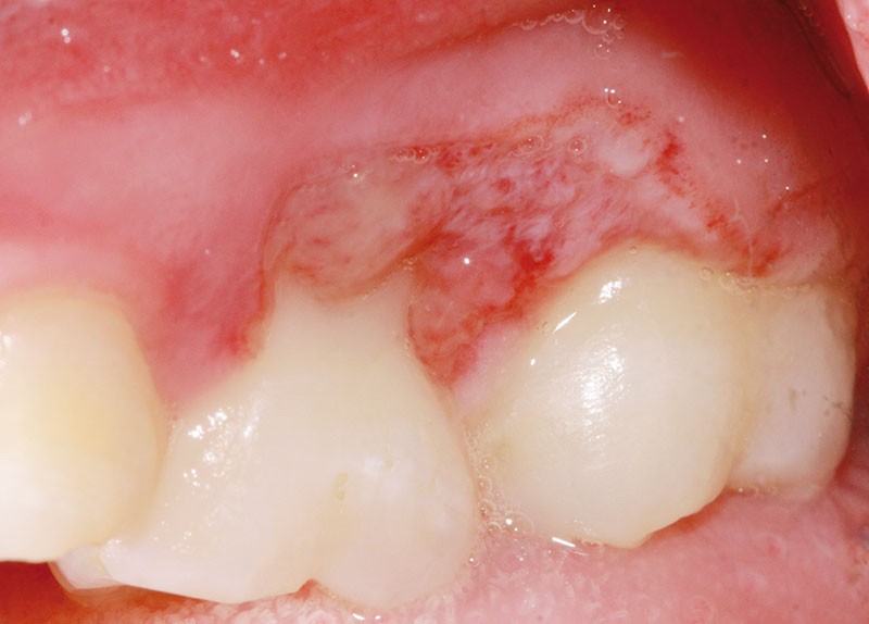 L’examen clinique révèle la présence d’une ulcération végétante, d’environ 1 cm de diamètre, localisée sur les gencives marginale, papillaire et attachée en vestibulaire de 55 et 16, associée à une récession parodontale pour 55. L’ulcération est bien délimitée, indolore et non hémorragique spontanément. Les dents présentent une mobilité physiologique et il n’existe pas d’adénopathie.