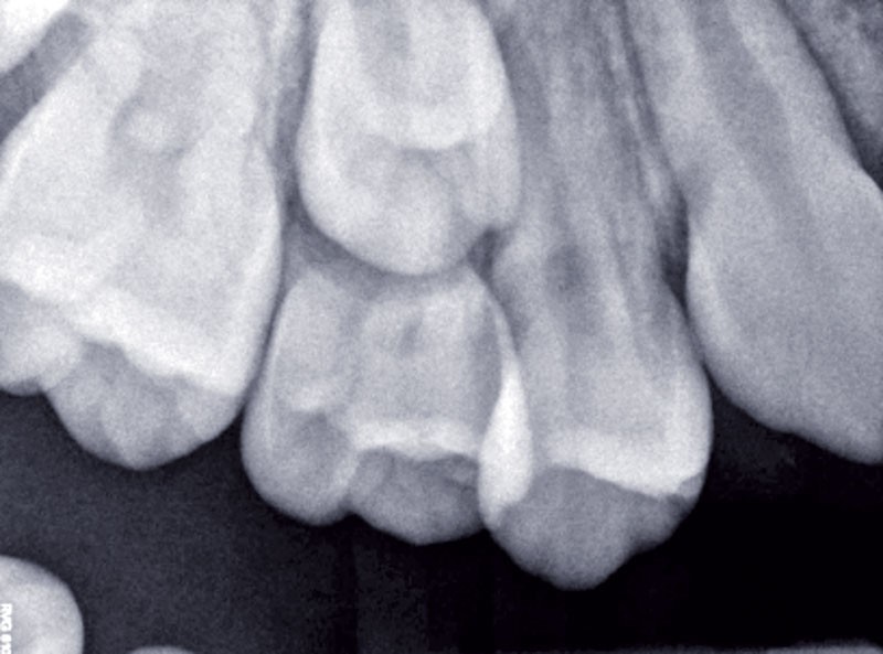 Un cliché rétro-alvéolaire et un orthopantomogramme confirment un processus de rhyzalyse physiologique de 55, comparable à celui de sa contro-latérale.