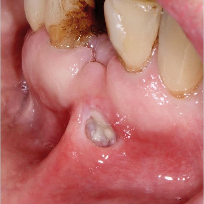Une patiente âgée de 78 ans consulte pour une blessure qui ne cicatrise pas dans le fond du vestibule antérieur mandibulaire. La patiente est fumeuse et présente une hypertension et cholestérolémie prises en charge médicalement ; par ailleurs elle est traitée par corticothérapie (Solupred®) depuis 2 semaines pour une alvéolite due à l’extraction de 31. L’examen clinique révèle une ulcération de 1 cm de la muqueuse alvéolaire vestibulaire en regard du site extractionnel, au-delà de la ligne muco-gingivale et débordant sur le frein labial inférieur. Le fond de la lésion est nécrotique et hémorragique au contact. Les bords supérieur et médian présentent un discret remaniement kératosique réactionnel. L’ulcération est douloureuse au contact et ferme à la palpation, sans induration notable. Il existe une adénopathie sub-mandibulaire homolatérale, mobile et douloureuse à la palpation. L’examen du CBCT montre un remaniement alvéolaire post-extractionnel, sans séquestre osseux apparent.