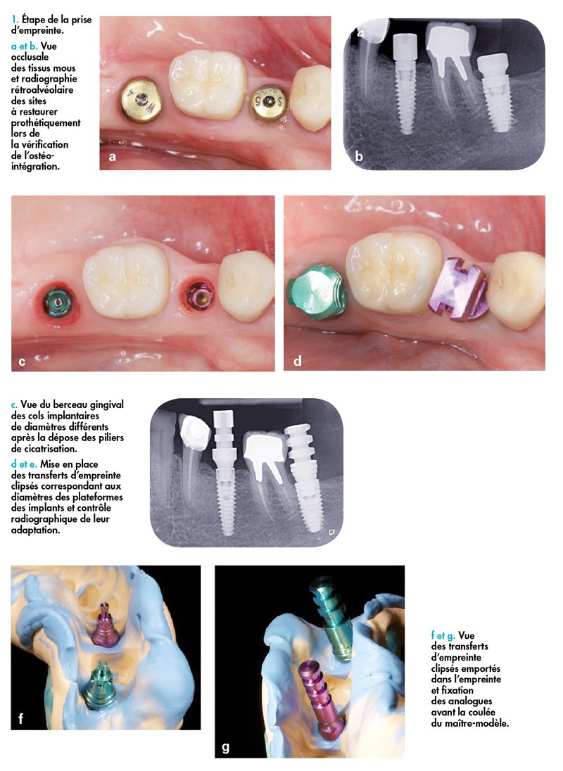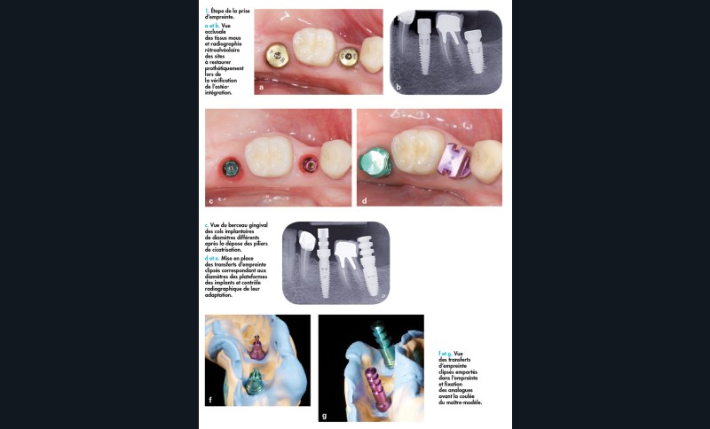Une empreinte est prise à l’aide de transferts d’empreinte clipsés destinés à être emportés dans l’empreinte. La bonne assise des transferts clipsés est radiographiquement contrôlée (fig. 1d et e). Les transferts d’empreinte (fig. 1f) reçoivent l’analogue d’implant correspondant au diamètre de sa plateforme (fig. 1g) et le maître-modèle peut être coulé.