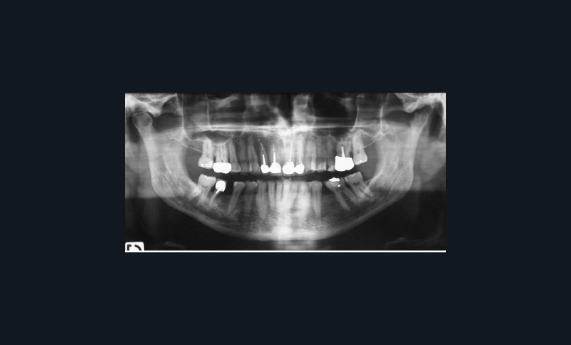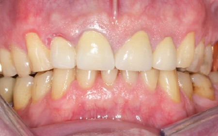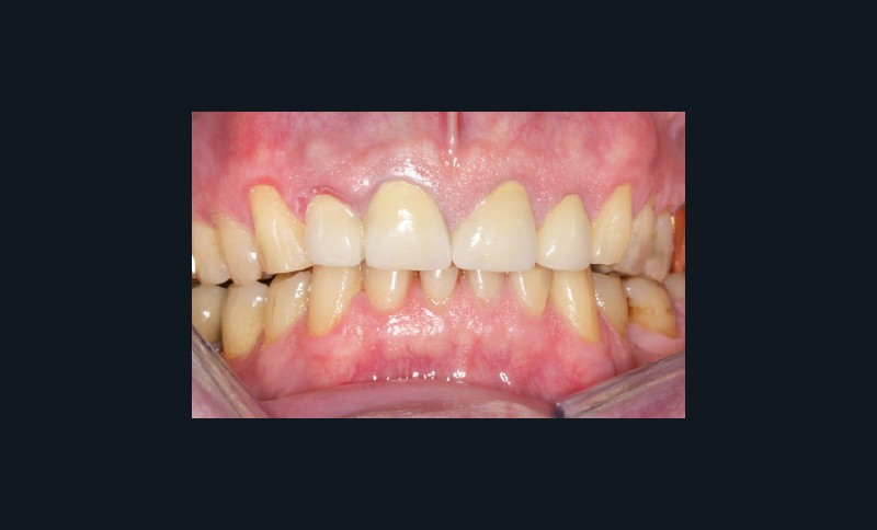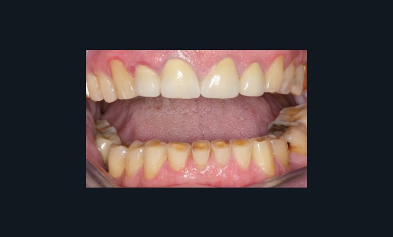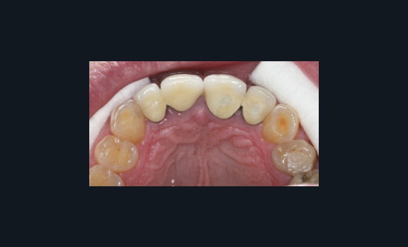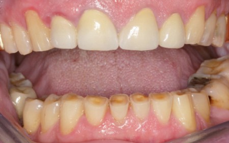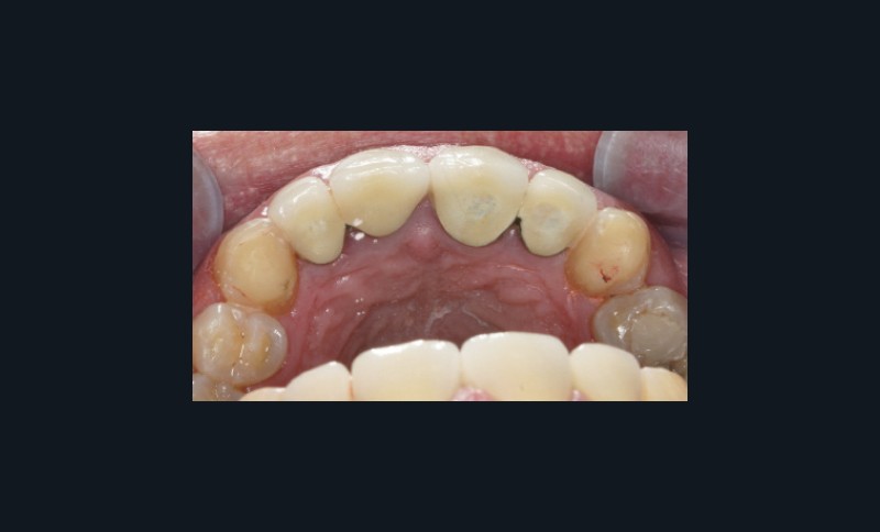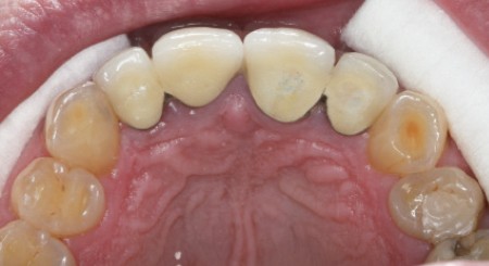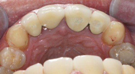 Bruxisme : net avec attrition antérieure marquée en particulier en regard des coiffes céramiques.
